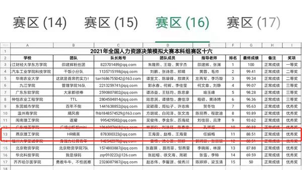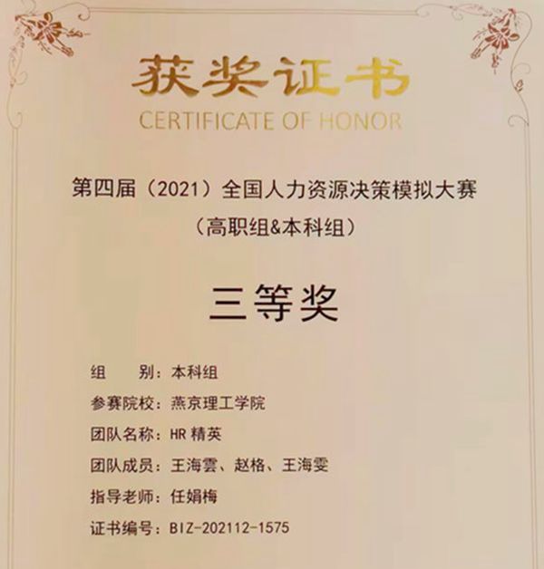 本网讯(国际商学院 乔恒康)近日,2021年全国人力资源决策模拟大赛成绩新鲜出炉,由国际商学院任娟梅老师指导,学生王海雲、赵格、王海雯、郝江波组成的“HR精英”团队最终决赛成绩88.51分,排名全国第11名,荣获优秀奖。