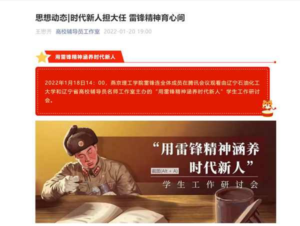 2022年1月18日14:00,燕京理工学院雷锋连全体成员在腾讯会议观看由辽宁石油化工大学和辽宁省高校辅导员名师工作室主办的“用雷锋精神涵养时代新人”学生工作研讨会。