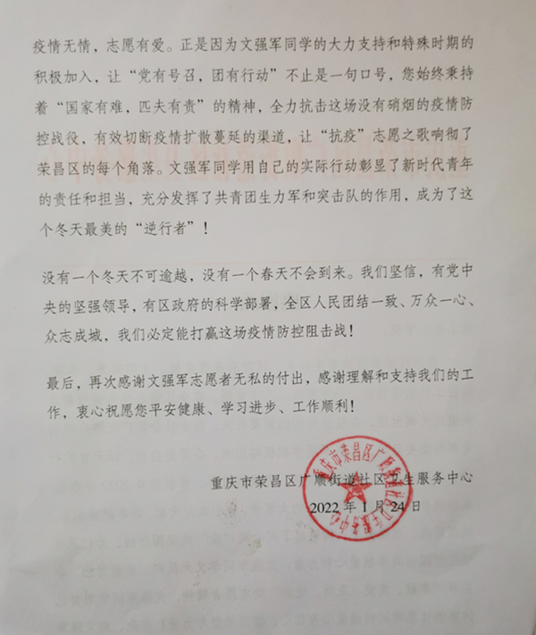 疫情无情,志愿有爱。正是因为文强军同学的大力支持和特殊时期的积极加入,让“党有号召,团有行动”不止是一句口号,您始终秉持着“国家有难,匹夫有责”的精神,全力抗击这场没有硝烟的疫情防控战役,有效切断疫情扩散蔓延的渠道,让“抗疫”志愿之歌响彻了荣昌区的每个角落。文强军同学用自己的实际行动彰显了新时代青年的责任和担当,充分发挥了共青团生力军和突击队的作用,成为了这个冬天最美的“逆行者”!