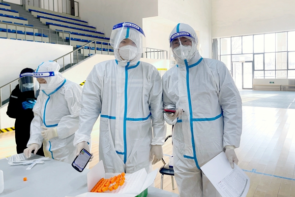本网讯(宣传部 体育学院 干部学院五期班 李家曾 谷是瑾 杨溢男 周阳 史建华)3月19日早5:50,在燕京理工学院封闭管理的教职工于海艳、周学材、薛栋、王思齐4位老师主动申请加入校园防疫志愿者队伍,根据核酸检测需要,在防疫工作人员的指导下,穿上防护服,戴上护目镜,按照分工高效配合工作人员开展核酸采集工作。