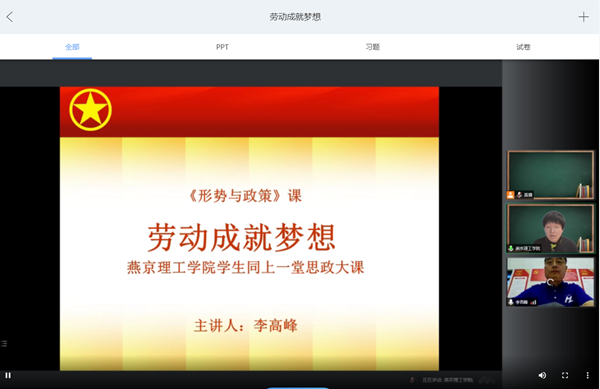 本网讯(马克思主义学院 丁娟 刘雯 高湘钧)为响应习近平总书记提出的“‘大思政课’我们要善用之”的号召,我校就如何办好新时代的思政课,积极探索,不断推进思政课教学改革创新,4月28日,在第72个中国劳动节和第103个五四青年节来临之际,马克思主义学院、学工部与团委联合组织全校学生相聚“云端”,同上一堂别样的《形势与政策》课,学校特邀全国劳动模范李高峰老师为学生们讲授了一堂以“劳动成就梦想”为主题的“思政大课”。这堂课由马克思主义学院《形势与政策》课程负责人丁娟主持。
