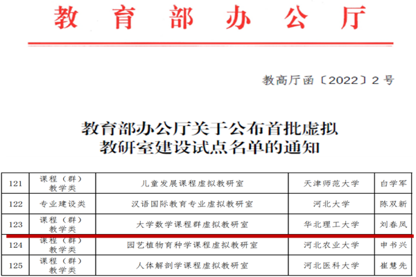 本报讯(建筑学院 张玲 田韵)日前,教育部办公厅公布了全国首批虚拟教研室建设试点名单,“大学数学课程群”虚拟教研室建设点共4个。其中由华北理工大学理学院国家级“万人计划”教学名师刘春凤教授牵头,我校数学教研室共同参与申报的“教育部大学数学课程群虚拟教研室”成功入选教育部首批虚拟教研室建设试点。