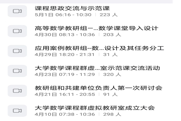 自4月10日以来,我校作为教育部大学数学课程群虚拟教研室成员单位,共参与高等数学、课程思政2个教研组(共11个教研组),目前已经参加线上研讨会6次,会议时长达20小时,学习报告10余个。