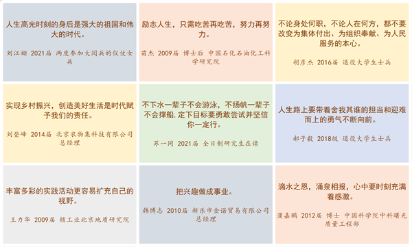 “不论身处何职,不论人在何方,都不要改变为集体付出、为组织奉献、为人民服务的本心。”“励志人生,只需吃苦再吃苦,努力再努力。”“人生路上要带着舍我其谁的担当和迎难而上的勇气不断向前。”“实现乡村振兴,创造美好生活是时代赋予我们的责任。”目前,校友总会正在征集优秀校友事迹,他们奋斗中的体悟也正成为激励在校学生更好学习、工作和生活的励志格言。