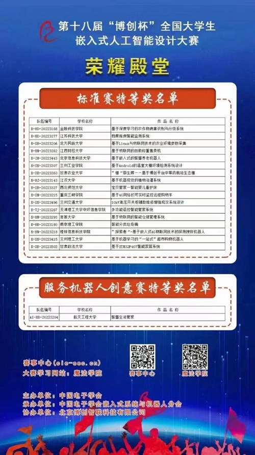 本网讯(信息科学与技术学院 孙昊)7月21日,由中国电子学会主办、中国电子学会嵌入式系统与机器人分会承办的第十八届“博创杯”全国大学生嵌入式设计大赛落幕,我校3名学生组队参赛的“智能分类垃圾桶”作品获得全国“标准赛”组别特等奖。