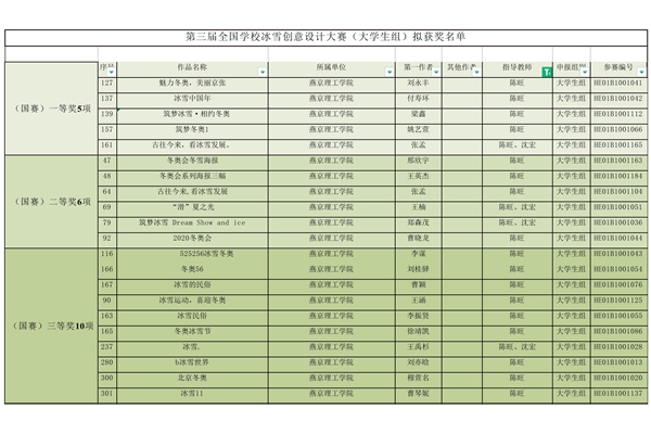 本网讯(艺术学院 陈旺)近日,由教育部、国家体育总局、北京冬奥组委和吉林省人民政府主办的第三届全国学校冰雪创意设计大赛结果揭晓,经过专家评委会的校赛初审、省赛复审和国赛的终审,我校艺术学院刘永丰等21名学生的参赛作品参加大学生组比赛并获奖,其中一等奖5人、二等奖6人、三等奖10人。