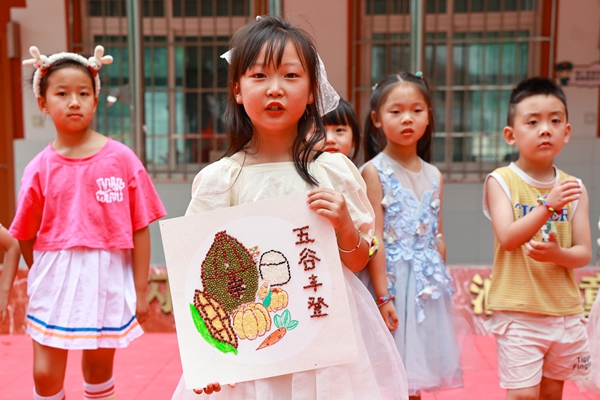 学生们在展示“五谷画”美术手工课作品