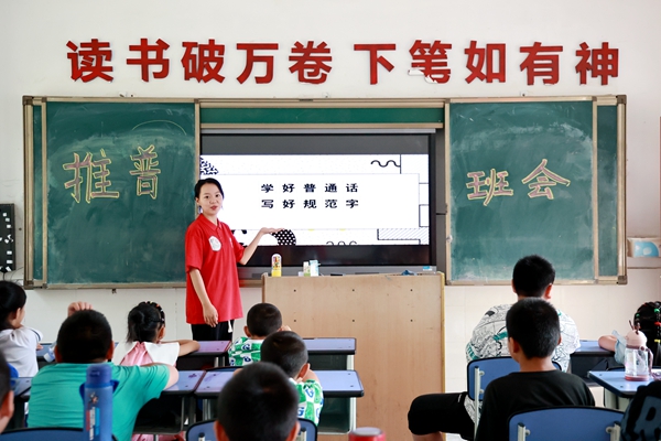 “黑兔和白兔,上山采蘑菇,小猴和小鹿,一齐来帮助……”校园里传来的孩子们争相诵读绕口令,是实践团策划开展的“青春向党推普行 语言文字助振兴”推广普通话活动,让孩子们在快乐的氛围中学好普通话,写好规范字。