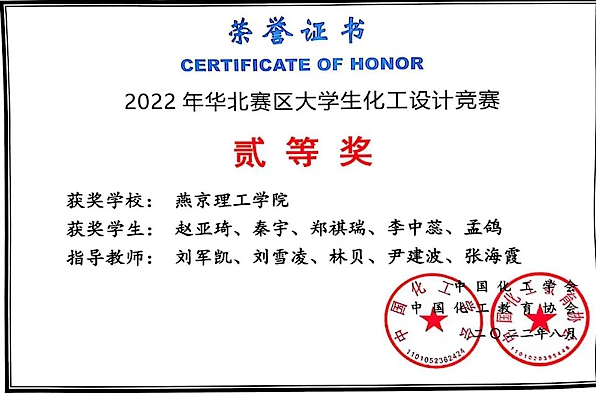 本网讯(环境与健康学院 陶薪羽)“天正设计杯”第十六届全国大学生化工设计竞赛成绩公布,我校环境与健康学院学子再创佳绩,获全国二等奖1项、华北赛区二等奖1项、河北省一等奖1项,二等奖1项,三等奖1项。