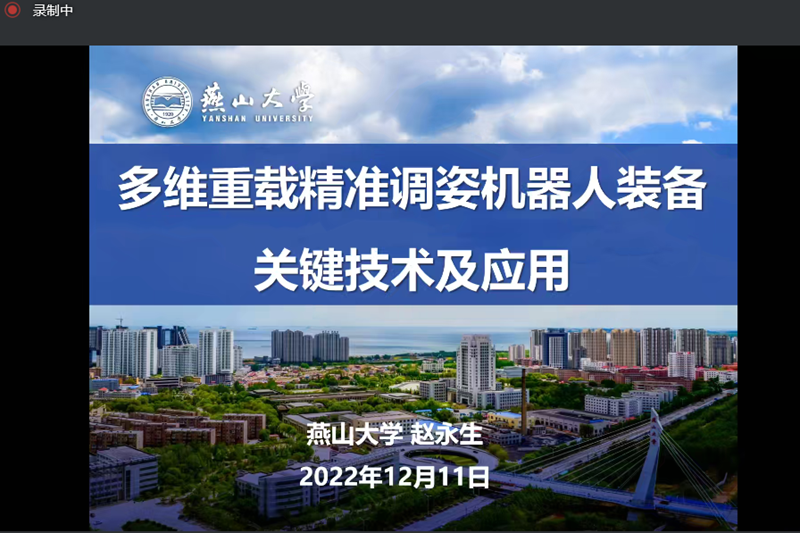 燕山大学赵永生教授以“多维重载精准调姿机器人装备关键技术及应用”为题进行了学术分享。他介绍了燕山大学机器人学科专业基础,调姿装备机构基础理论研究情况,多维精准调姿装备研究成果与应用。在交流环节,赵教授阐述了工程项目教育在教学上的应用,认为项目教学有助于帮助学生更好地理解专业课程,锻炼学生的动手动脑能力。