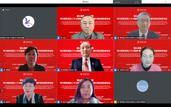 本网讯(马克思主义学院 曲文强)为深入学习宣传贯彻党的二十大精神,全面落实立德树人根本任务,12月14日至15日,由燕京理工学院主办的“学习贯彻党的二十大精神•聚焦‘三进’提升思政课实效”高峰论坛线上举办。论坛邀请首都经济贸易大学、北京师范大学、上海交通大学、河北经贸大学、河北师范大学、河北大学、河北科技大学等高校专家学者作主题报告,进行研讨交流。武汉工程科技学院、成都文理学院等来自全国20余所高校马克思主义学院的教师参加了论坛。