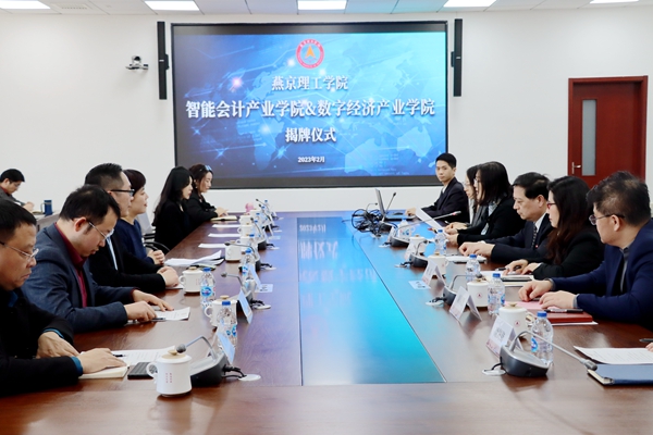 本网讯(教务处 李丽荣)2月24日,为进一步深化校企合作,探索共建产业学院新思路,实现校企双方共赢,我校与肯赫教育科技有限公司达成战略合作,共建“智能会计产业学院”、“数字经济产业学院”。产业学院成立暨揭牌仪式在我校综合楼328室举行。