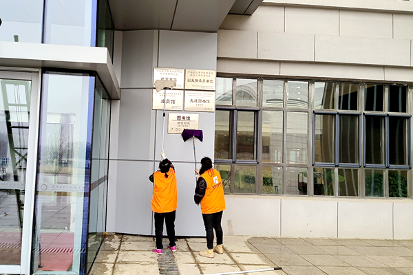 保洁板块组织保洁工作人员对综合楼、体育馆、图书馆、教学楼台阶、商业街和全校主要路面进行清洗冲刷、清理校园卫生死角和垃圾,严格按照保洁服务标准和操作要领要点,严把保洁服务质量关。