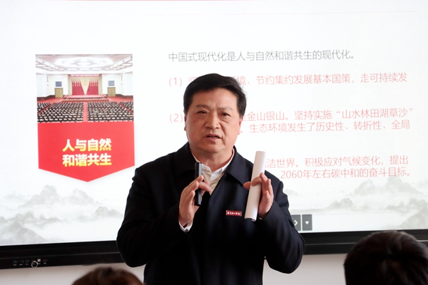 2023年是贯彻党的二十大精神的开局之年,是实施“十四五”规划承前启后的关键一年,是为全面建设社会主义现代化国家奠定基础的重要一年。杨校长以时间轴为主线讲述了中国式现代化的历史背景。他还从人口规模巨大的现代化、全体人民共同富裕的现代化、物质文明和精神文明相协调的现代化、人与自然和谐共生的现代化、走和平发展道路的现代化五个方面深度剖析了中国式现代化的特征。杨校长谈到,中国式现代化内涵丰富、博大精深,为实现人类文明新形态贡献了中国智慧、中国方案。在中国共产党领导下,全国人民埋头苦干,踔厉奋发、勇毅前行,一定能如期建成社会主义现代化强国,实现中华民族伟大复兴。