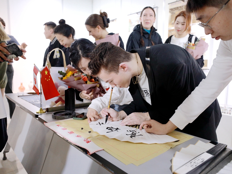 同学们准备的中华传统文化体验活动让艺术家们沉浸其中,并在“一起向未来”的中英书法作品上留下签名。