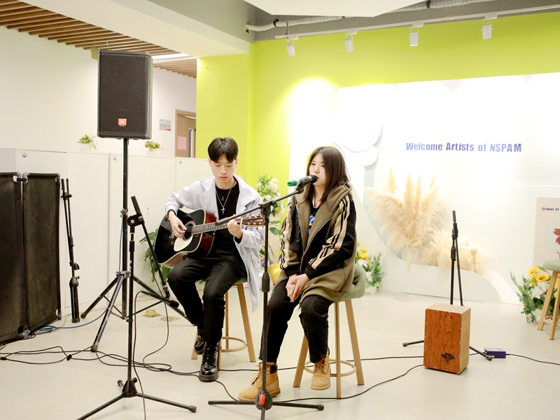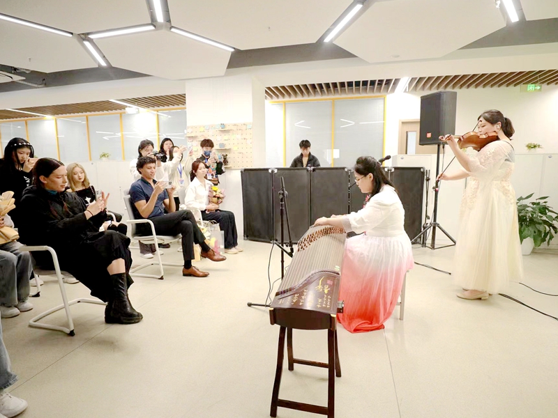 同学们热情的用行动、用作品和艺术家们进行交流。英语专业的国际班学生杨艺和法学专业赵怡轩用小提琴和古筝演奏了电视剧主题曲《知否知否》,国际班学生何臻和建筑学专业刘运博、戏剧影视表演专业孙成宏、工程造价专业李政妍组建的乐队表演了电视剧《西游记》里的经典插曲《女儿情》和英国民谣经典《let her go》。