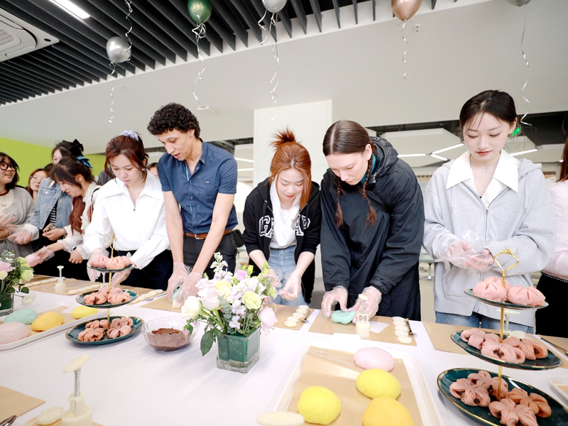 共品海棠美食,共话精彩未来。英语专业的国际班学生任泓铮向艺术家们介绍了学校校花海棠及海棠文化节的由来。4月初的燕理,满园海棠含苞正放,作为海棠文化节的经典活动,环境工程专业的姚紫萱向艺术家们介绍了海棠酥的制作过程,并和同学们一起邀请艺术家制作传统美食海棠酥,在品味独属于燕理文化的海棠美食中畅谈大学学习生活,展望美好精彩未来。
