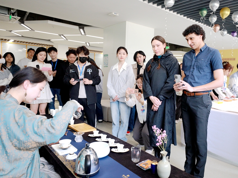 戏剧影视导演专业任艺青同学是国家中级茶艺师,她以茶会友,现场进行了茶艺表演,邀请艺术家和在场同学们一起品茗。从古代丝绸之路、茶马古道、茶船古道,到如今的丝绸之路经济带、21世纪海上丝绸之路,茶从中国出发,穿越历史、跨越国界,受到了世界各国人民喜爱。