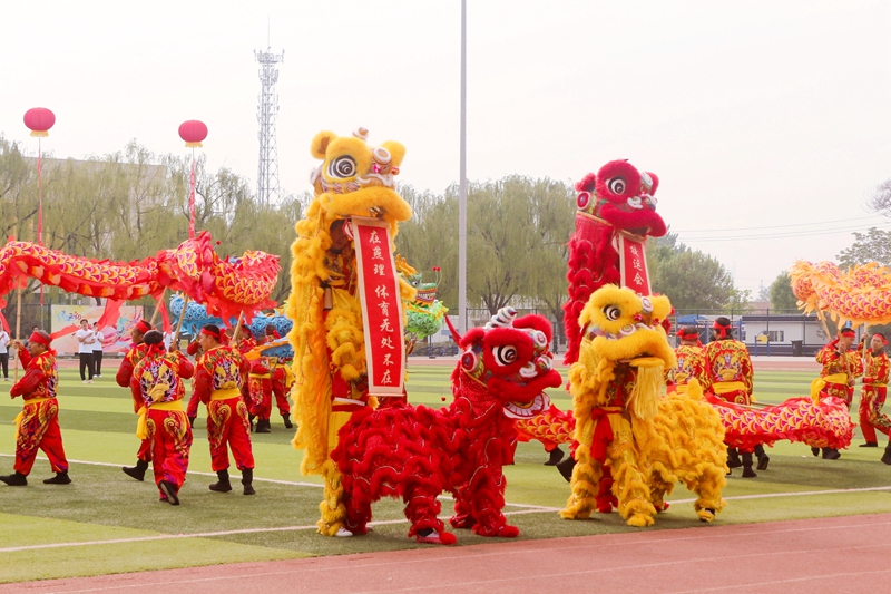 在盛大、精彩的龙狮表演中,各学院精彩纷呈的文体表演依次展示。体育学院学子身着奥运五环颜色的衣服,团结一致围成五环形状。国商学子身着白蓝服饰,带来了元气满满的啦啦操表演,以最活力的状态舞动于操场中心,伴随着欢快的音乐,闪耀的花球亮出绚丽的光彩。建筑学院方阵团身着安全头盔与绿色背心,迈着矫健的步伐,高喊加油口号,精神饱满,英姿飒爽。智能工程学院在机器人玩偶的带领下,挥舞大旗,形成旗阵。击鼓舞扇,古装扮相,文法学院带来丰富多彩的开场表演。彩旗飘飘,扇舞翩翩,艺术学院组成五环及党旗等图案,展现着开拓创新、锐意进取的精神风貌。整齐划一,脚步铿锵,传媒学子载歌载舞。信息学子高举京京以心起誓,在蓝天下放飞寄满希望的气球。会计学子高扬院旗、手持花伞、步履整齐,以自信的笑容彰显青年风采。环境与健康学院手捧向日葵,带来活力四射的健康操表演。