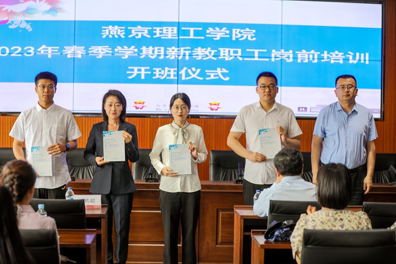 党委副书记、副校长王传超现场向新教师代表赠送了《燕京理工学院课堂教学设计指南》。该书由学校干部学院五期班编写,旨在帮助新教师学习和了解课堂教学规律,更好的完成课堂设计,进而提高教学水平。