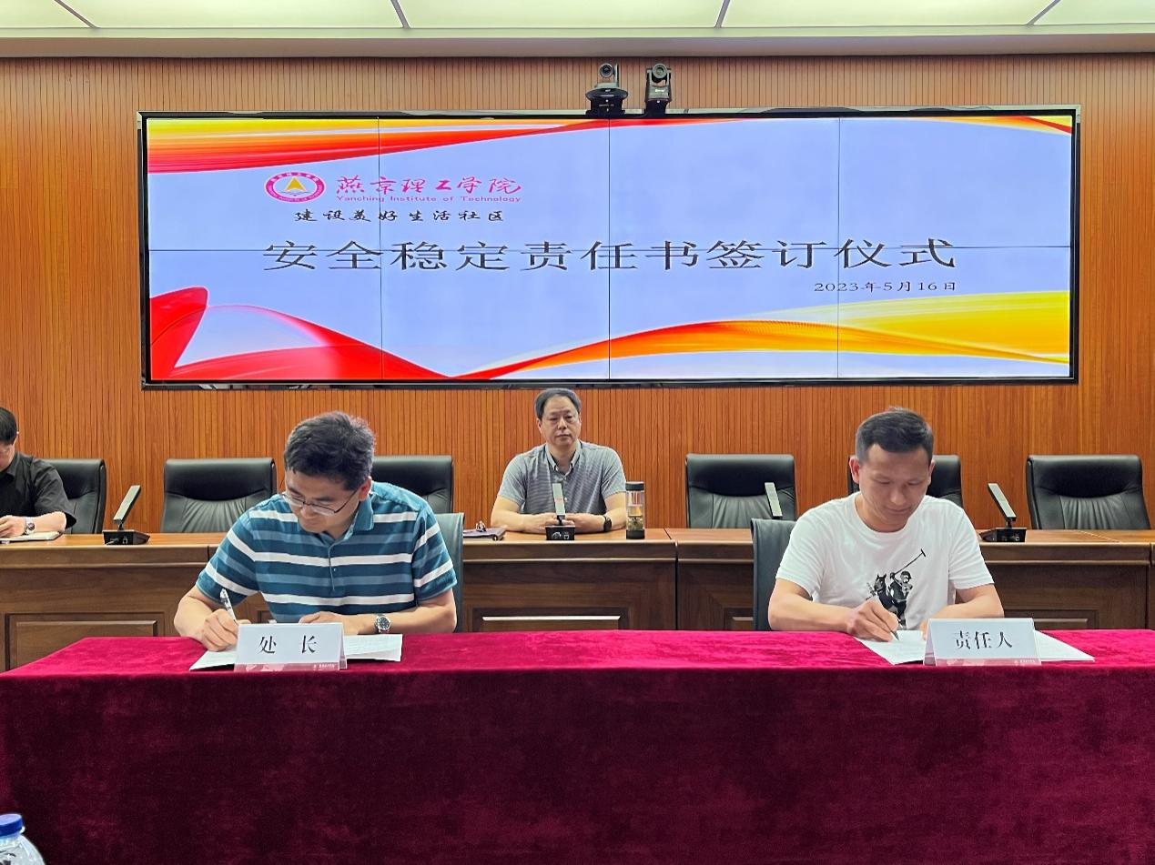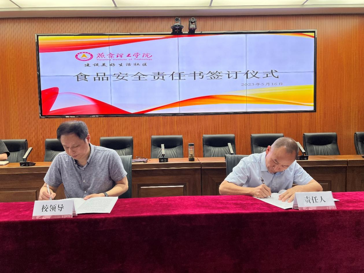 会议后举行食品安全责任书的签订仪式,宋伟副校长、赵生光处长与餐厅、味林西餐厅的负责人分别签署责任书。