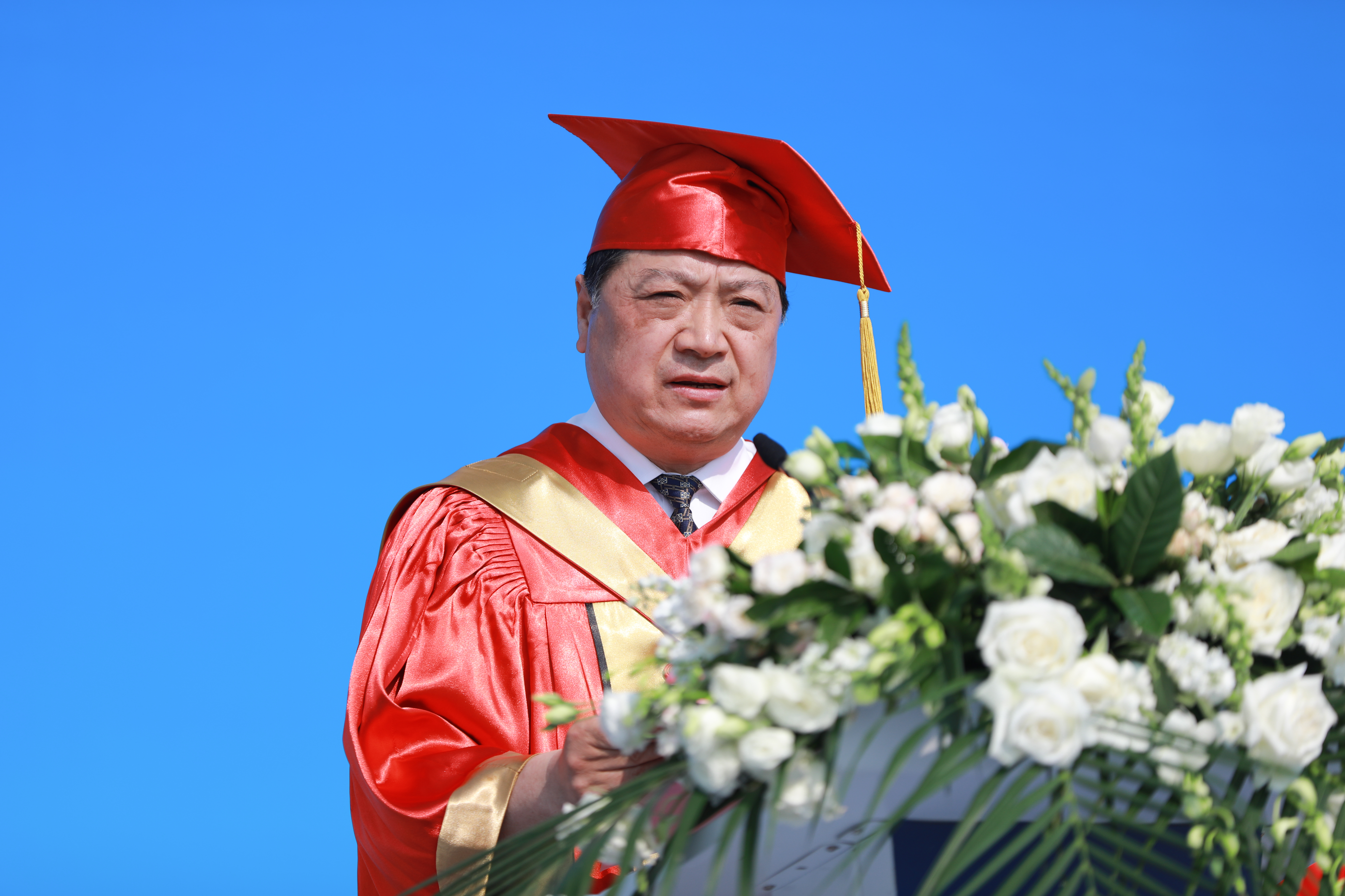 他激励广大毕业生恪守“勤奋创新 璞玉成器”的校训,争做现代化强国建设的主力军,积极迎接充满希望和挑战的未来,为祖国建设贡献贡献聪明才智。他说,党的二十大为我们描绘了建设社会主义现代化强国的宏伟蓝图,以中国式现代化推进中华民族伟大复兴。他希望同学们坚定信仰,奉献祖国人民;务实笃行,躬身伟大时代;探索创新,书写精彩人生;热爱生活,拥抱健康世界。他期待同学们按照习近平总书记对青年学生提出的要求,牢记党的教诲,立志民族复兴,不负韶华,不负时代,不负人民,在青春的赛道上奋力奔跑,争取跑出当代青年的最好成绩。