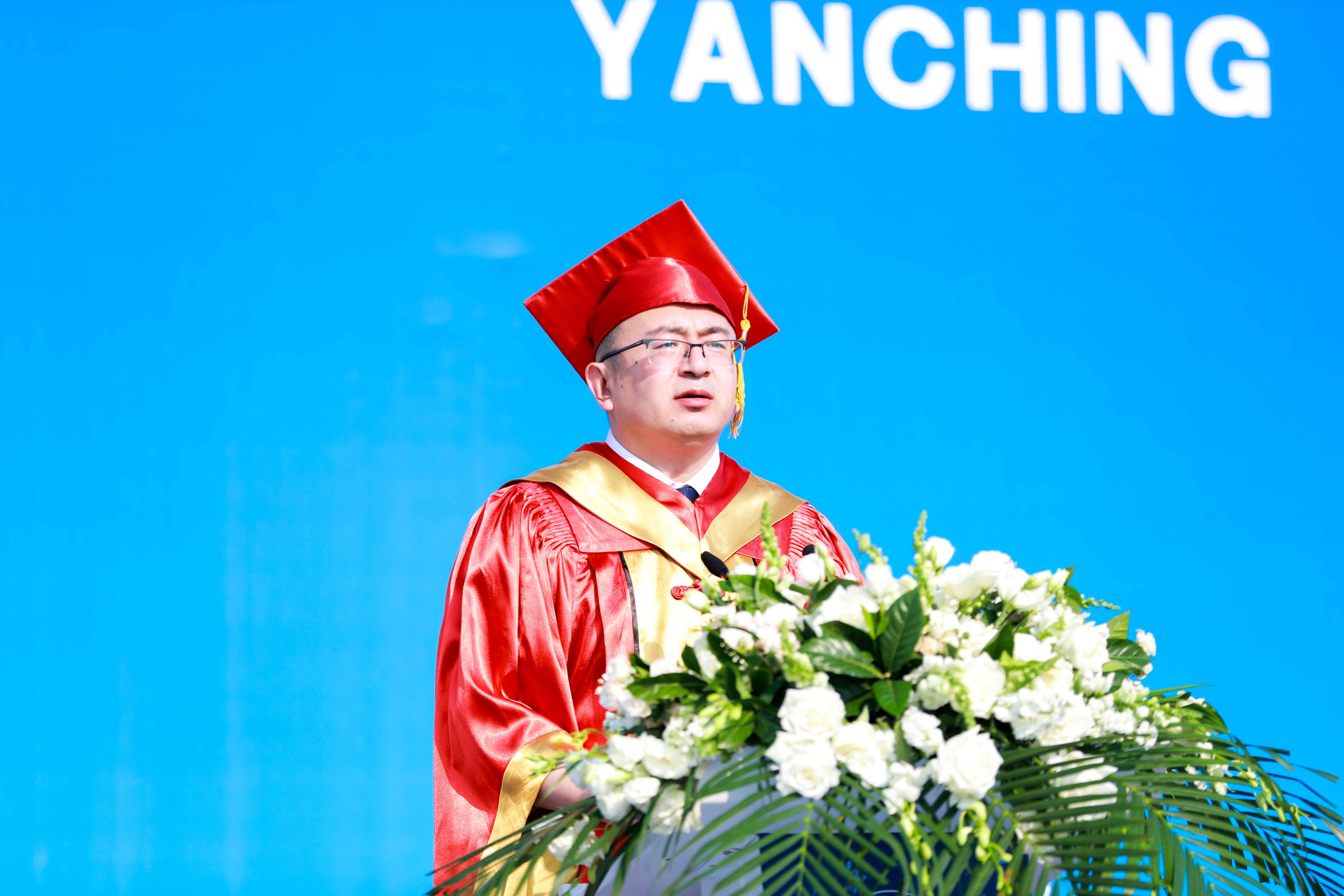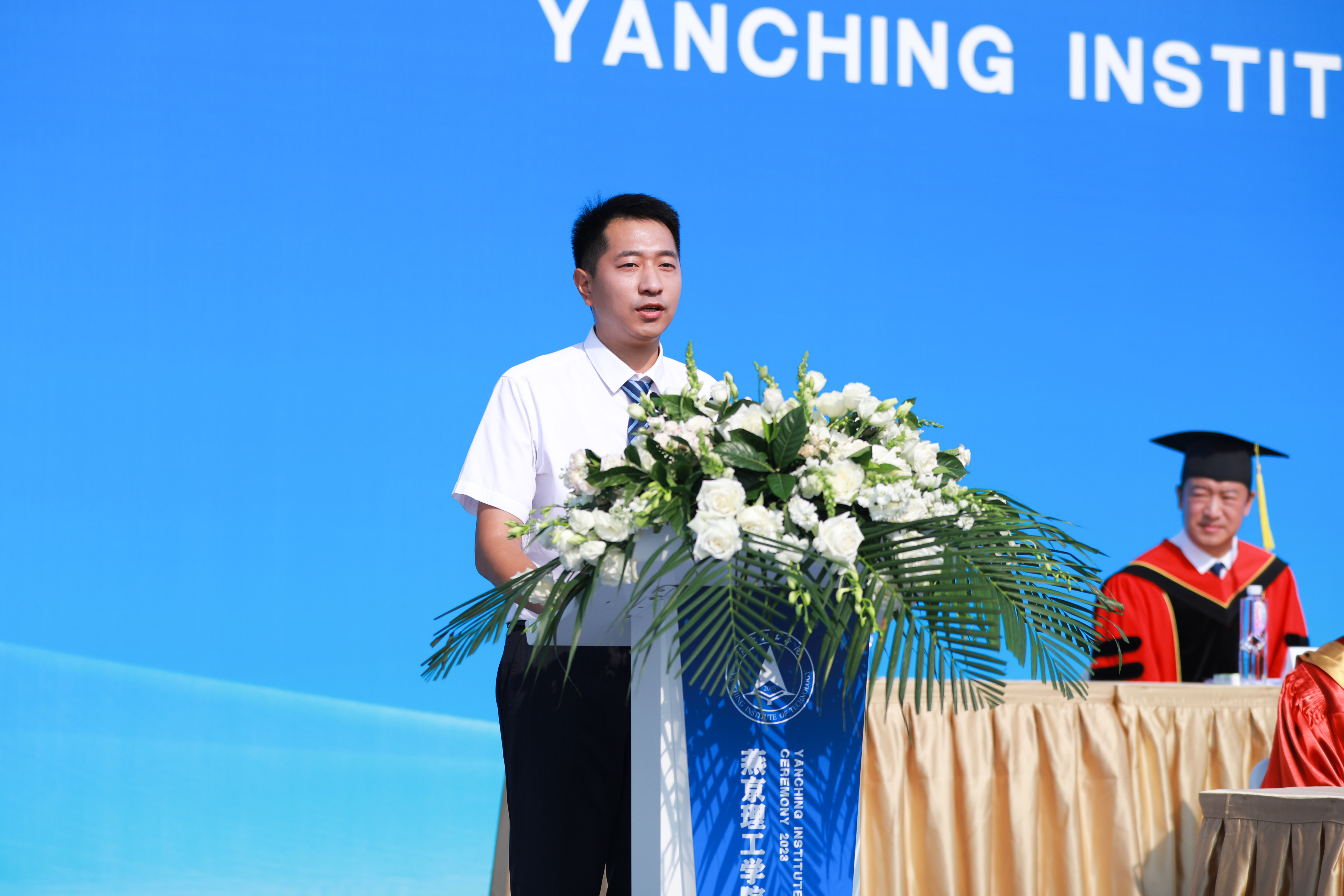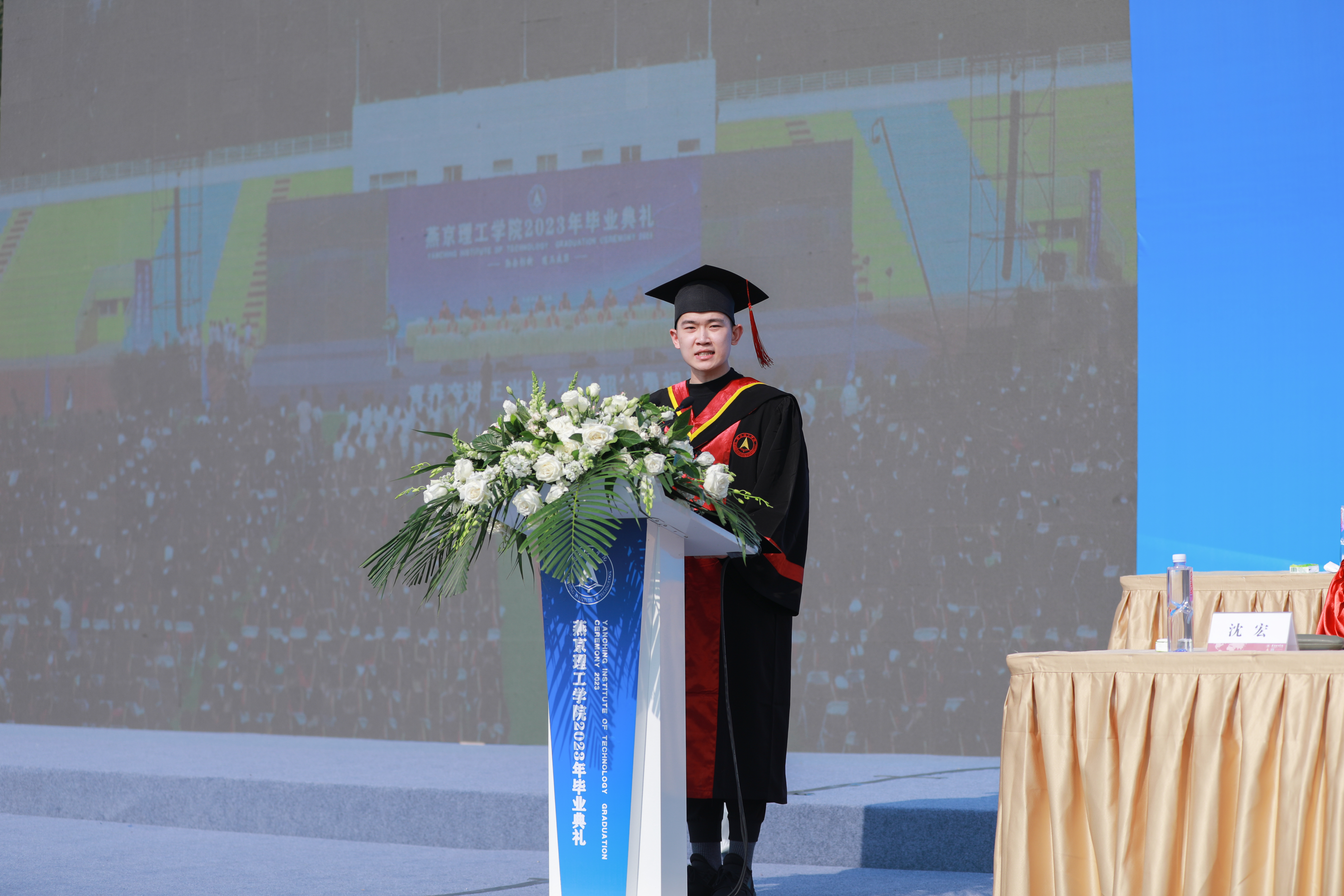 毕业生代表、文法学院郑涛发言,代表毕业生向母校燕理、向求学期间所有师长和亲友表达了感谢。他分享了个人学习成长的经历,期待大家珍惜珍贵的大学时光,要不断汲取知识力量,怀着无限大的热情去搏一个美好的未来。