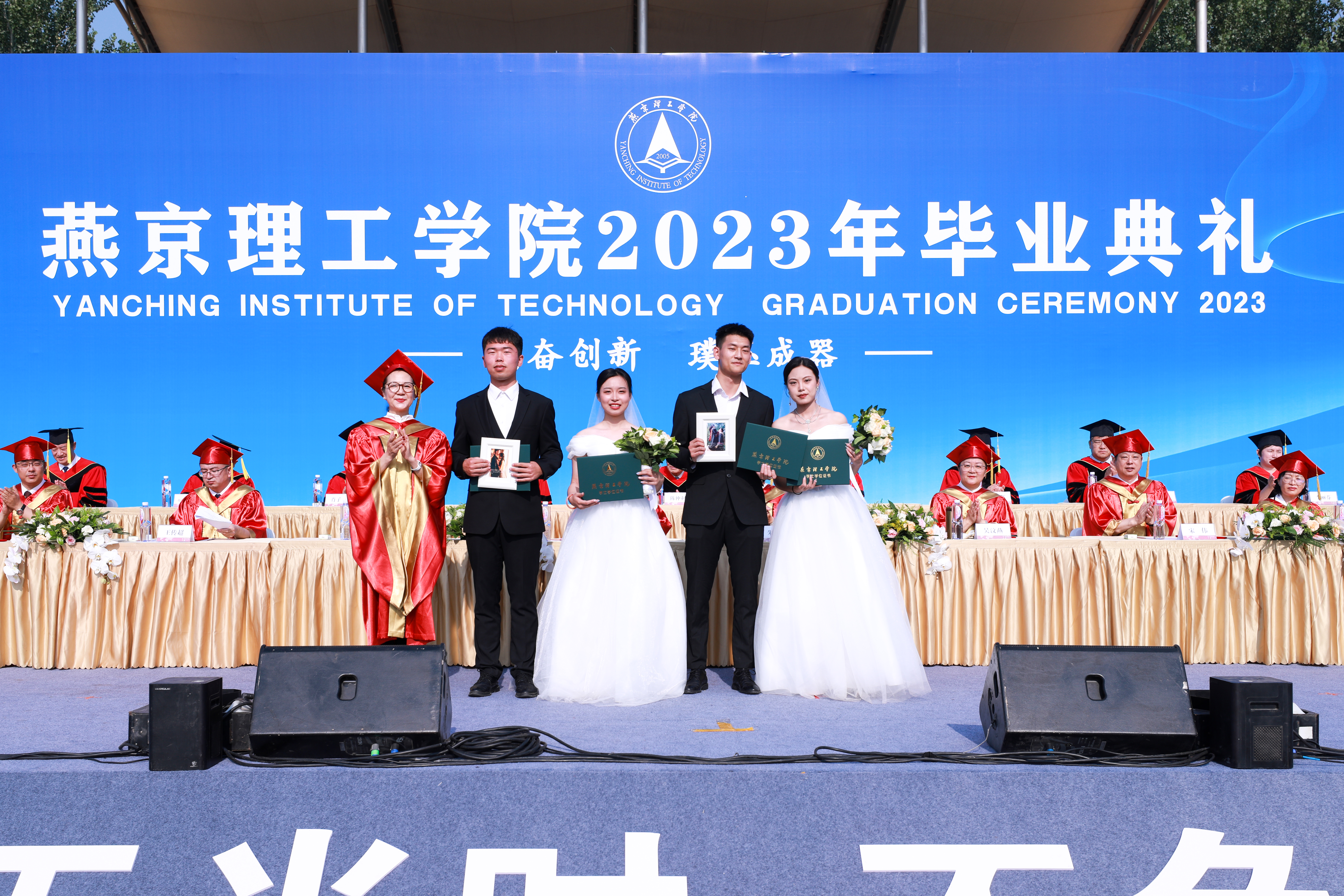 “祝福你们永结同心,比翼双飞!希望你们今后喜乐共分享、同量天地宽,用忠心、孝心、诚心、爱心、恒心面对生活,获得爱情事业的双丰收。燕理永远是你们的家,记得常回家看看。”从学生证到结婚证、从校服到婚纱,毕业之际准备走进婚姻殿堂的肖云龙、宋丽颖和刘州洋、赵雪身穿结婚礼服参加典礼,党委常务副书记、副校长刘元园向他们颁发学位证书,并赠言祝福。