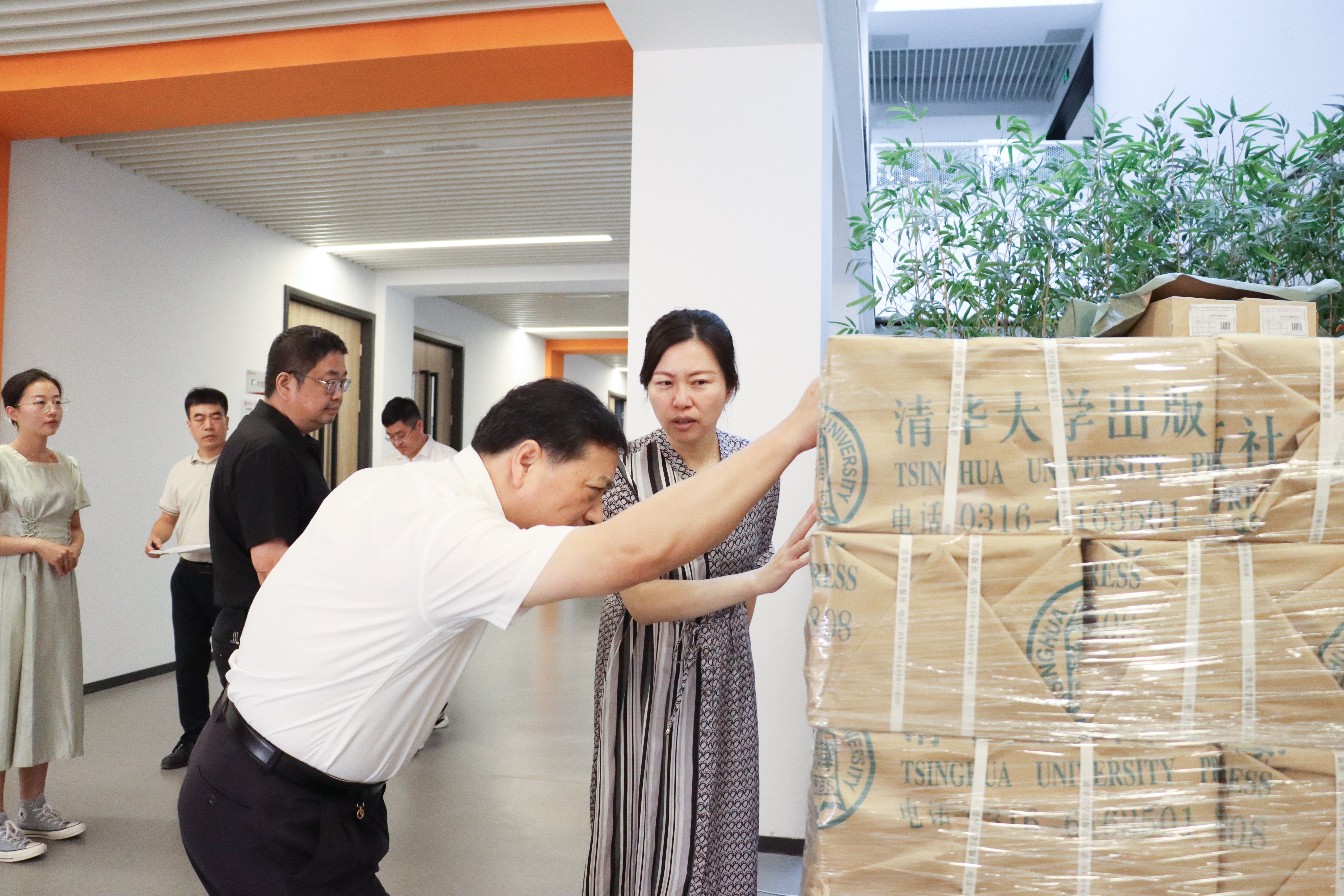 随后,杨庚宇校长和吴敏副校长一行来到F教学楼,查看了新学期图书配送到校以及发放情况。据教务处负责图书发放的李沫老师介绍,暑期全校图书统一筹划,开学前所有图书陆续配送到校,大二至大四学生教材全部分发完毕,当下正有条不紊整理大一新生教材,保证大一新生开学前师生们能领到各科教材,做到“课前到书,人手一册”。现场工作人员从搬运、拆包、分类、核对有序开展工作,按学院、班级提前统一分好并码放整齐。