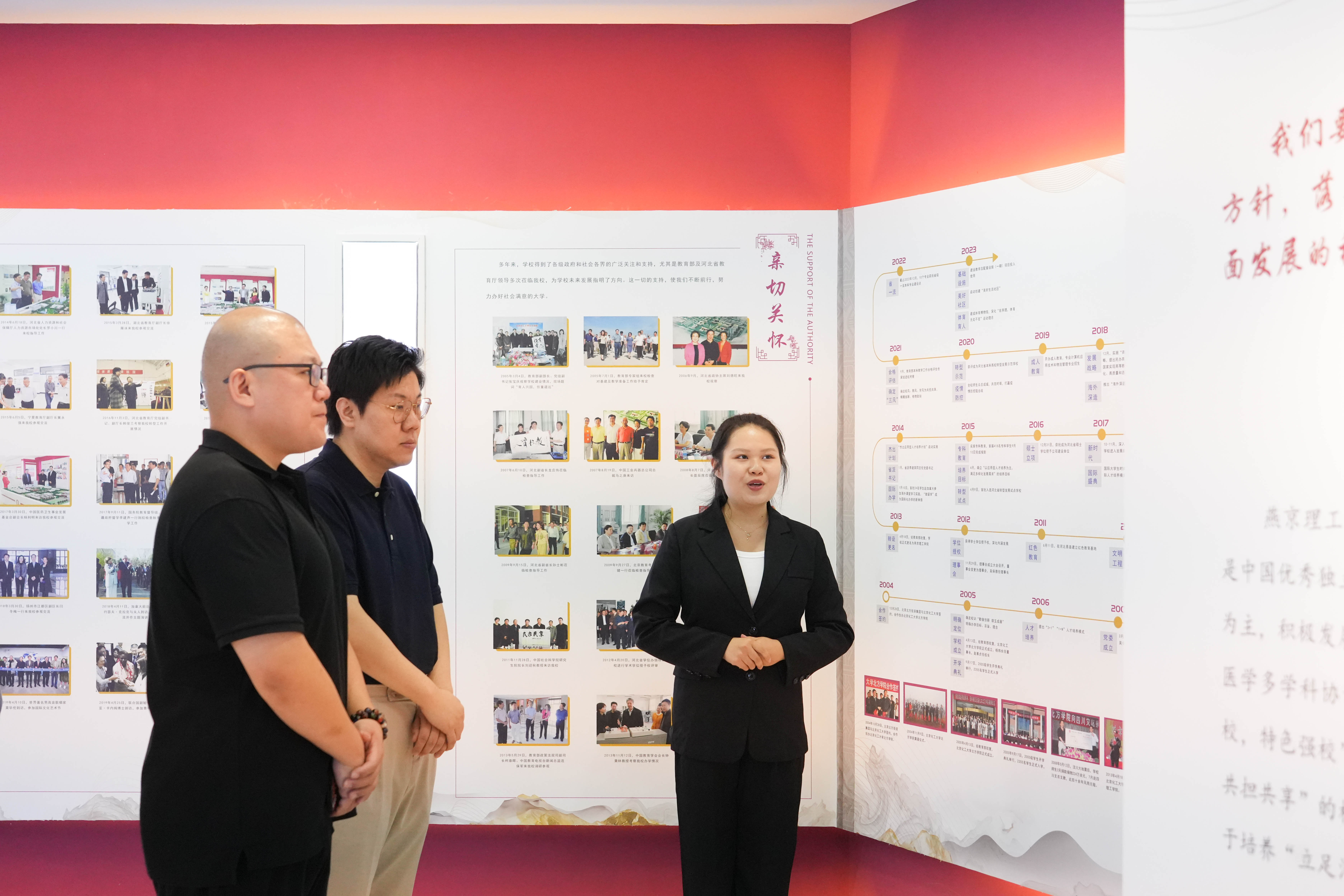 殷楠总编辑一行参观了校史馆、艺术展厅、传媒大楼等燕京理工学院具有代表性的地标性场馆。校史馆溯往至今,燕京理工学院学院的发展沿革跃然于眼前,殷楠总编辑一行对学校的发展和办学水平表示了高度肯定。在艺术展厅,从传统的雕塑到潮流的衣装,再到充满中国元素的室内外装置艺术设计,殷楠总编辑一行对艺术学院学子制作的作品表示由衷的赞叹,尤其是对学校吉祥物“京京”的盲盒系列表示了深度喜爱。传媒大楼内,8K超高清影像实验室、调色实验室、电竞中心等本专业特色实验室为学子提供坚实的技术条件与实践条件,殷楠总编辑一行对学校的引领行业的硬件条件致以高度赞可,纷纷表示“足不出校”即可体验行业发展前沿。