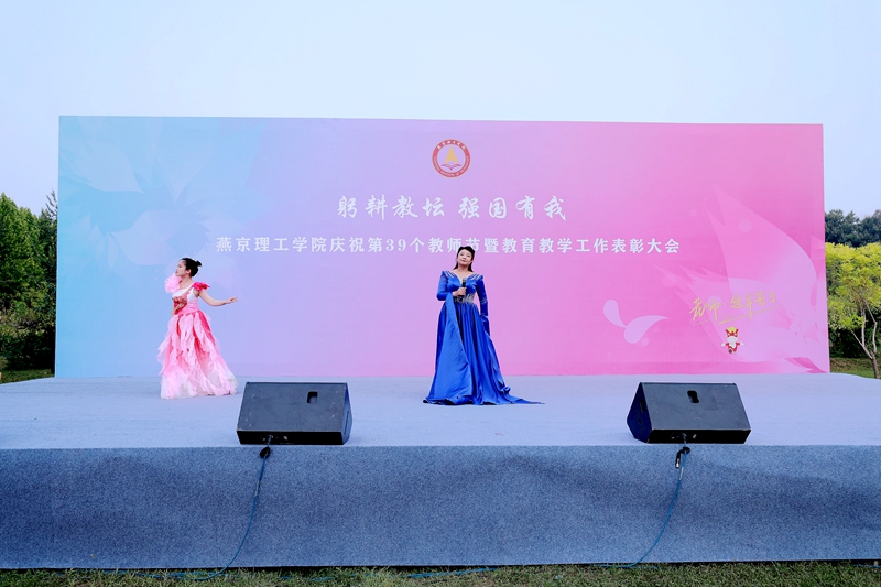 校艺术团的《奔跑的青春》青春洋溢,拉开了文艺演出的序幕。“多少真爱化作化作江河万古长流,不管什么时候,不管什么地方,我的爱为你保留……”传媒学院任志心的《我的深情为你守候》歌唱出广大教师“春蚕到死丝方尽,蜡炬成灰泪始干”的奉献之情。从四川平武到三河支教,燕理学子的志愿支教之路赓续初心,薪火相传,把成长书写在祖国大地上,校艺术团朗诵的《支教,我们一直在路上》诉说着将青春寓于责任担当,用奋斗谱写青春乐章的责任与承诺。传媒学院宗琪表演的《感恩》致敬所有辛勤工作在教师岗位的广大教师。芳华待灼,砥砺深耕,奋楫笃行,履践致远,广大教师将自己的青春奉献于教育教学,传媒学院岳晓宇的舞蹈表演《芳华》诠释着“桃李不言,下自成蹊”的育人初心。李姝涵的《我的祖国我的家》歌声嘹亮,校艺术团的《万疆》歌唱信仰与坚守,为“躬耕教坛,强国有我”燕京理工学院庆祝第39个教师节暨教育教学工作表彰大会献上终章。