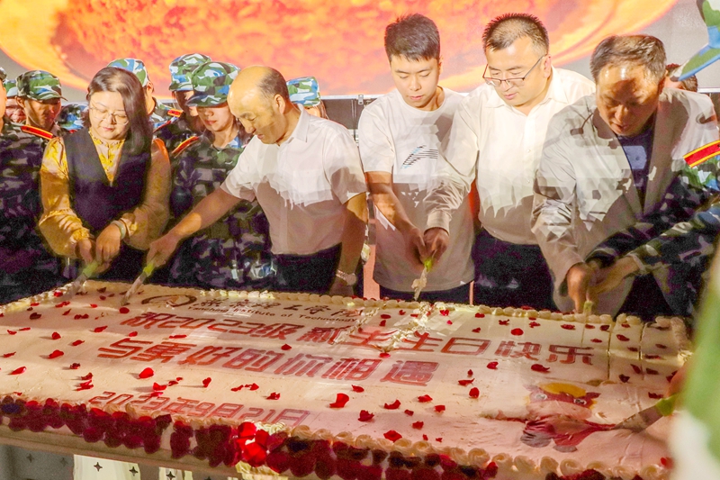 校领导和同学们为2023级新生庆祝生日。舞台上,寿星们许愿的同时,学校为在场的14000余名师生送上暖心可乐。全场共喊“生日快乐”,生日庆祝属于寿星们,也属于在场的所有同学,恭喜他们踏入新生活,步入人生的新阶段,希望全体新生把今天作为新的起点,不断努力,不忘初心,在燕京理工学院绽放出自己光芒。2023届优秀校友温佳俊带来一首《特别的爱给特别的你》,送给恩师,送给父母,也送给在场的所有观众。