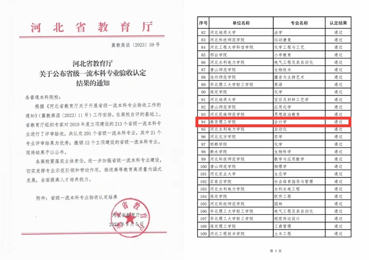 近日,经河北省教育厅关于省级一流本科专业验收认定结果公示,燕京理工学院会计学院会计学通过省级一流本科专业验收认定。