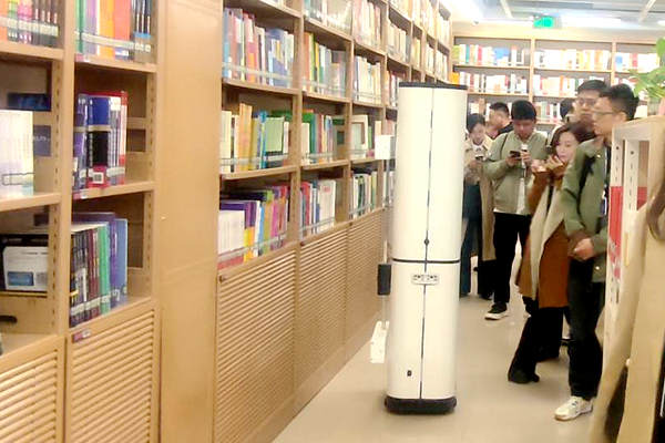 来访同仁对图书馆学习环境的营造空间的合理利用,及智能设备的投入使用等方面表现出极大兴趣,对图书馆的建设表示了高度赞赏。图书盘点机器人是图书馆今年新启用的设备,与图书管理系统对接后,可进行自主定位、巡架扫描,找出错放图书,协助解决错架、乱架等问题,为流通管理、馆藏盘点工作带来了很大便利,成为读者精准化查阅图书的有力保障。