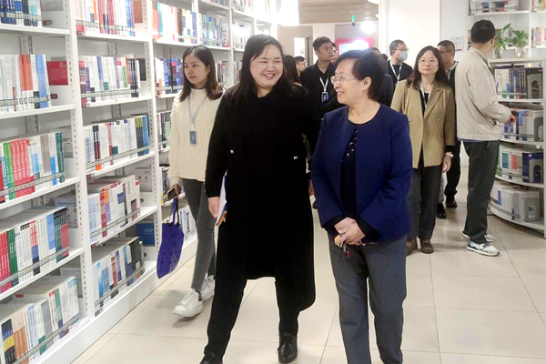 在图书馆,图文信息中心主任张萍和同事们一起向来访同仁介绍了馆内建设情况。大家先后参观了自助查询机、自助借还机、盘点机器人等先进设备,了解了多功能学习室及各类阅览室的使用情况。