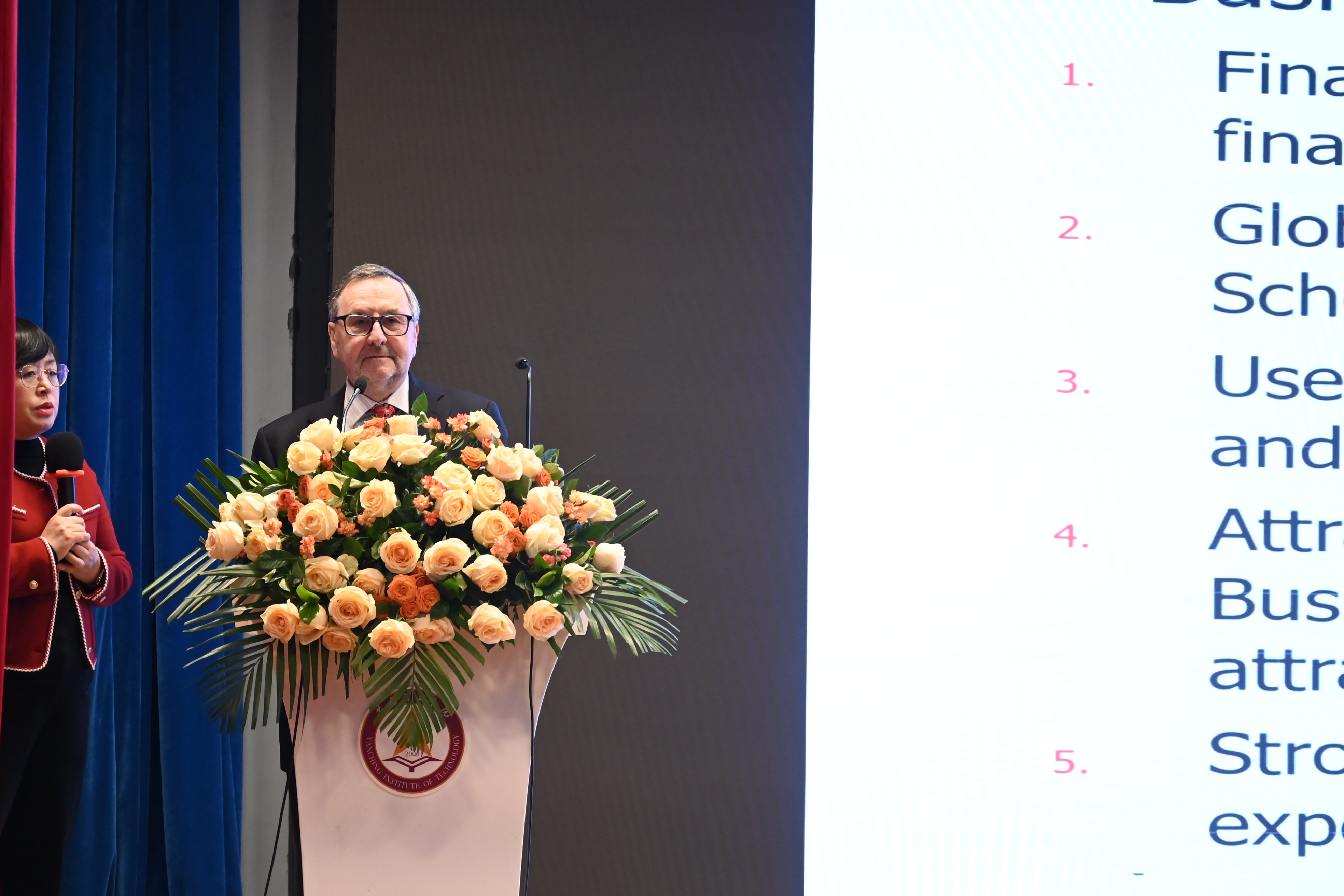 校长杨庚宇对米歇尔·德洛姆博士一行到访我校表示热烈欢迎,并介绍我校发展历程、师资及学院专业设置等情况,以及与京津冀产业对接、符合行业需求等,为经济社会发展对接人才培养等教育教学举措。