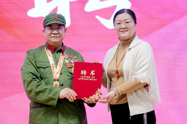 副校长吴汶燕为柳宝平班长颁发社会导师聘书。柳宝平班长将根据亲身经历撰写的《1979难忘的岁月 中越边境自卫还击站回忆录》赠送于“正心感恩宣讲团”,传承红色血脉。