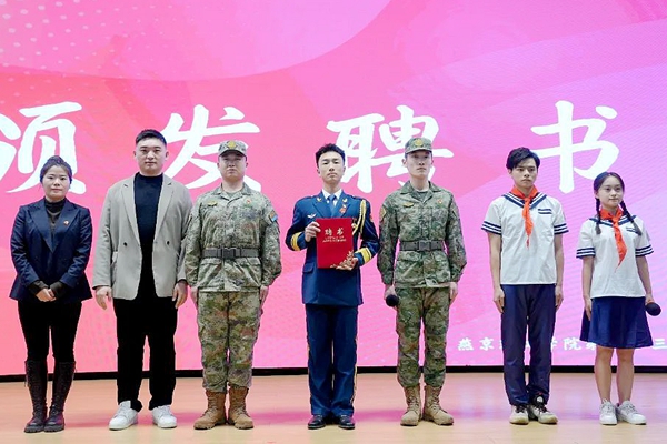 燕京理工学院“正心感恩宣讲团”团长朱雷为林赤洋颁发聘书。