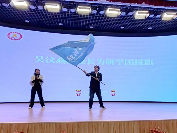 李默然同学作为研学代表接受了副校长吴汶燕的授旗。李默然同学表达了对海外深造国际班平台的感激之情,并详细阐述了此次研学的目的。