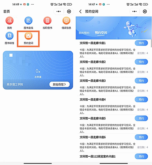 清晨的图书馆门外,总有无数勤奋的读者,早早地等候大门的开启,方便第一时间进馆找到专属席位。为了缓解读者早起排队的压力,高效利用座位资源,创建良好的文明学习环境,图书馆开通了座位预约系统,读者只需关注“燕理图文信息中心”微信公众号,在“掌上图书馆”中预约座位,就可解决早起排队抢位的辛苦。目前,文科馆一、二层,理科馆协作室共1000多座位均实现在线预约;文科馆三、四层阅览室和公共区域,理科馆302期刊室和公共空间座位无需预约,便于读者根据自己需要灵活选择。