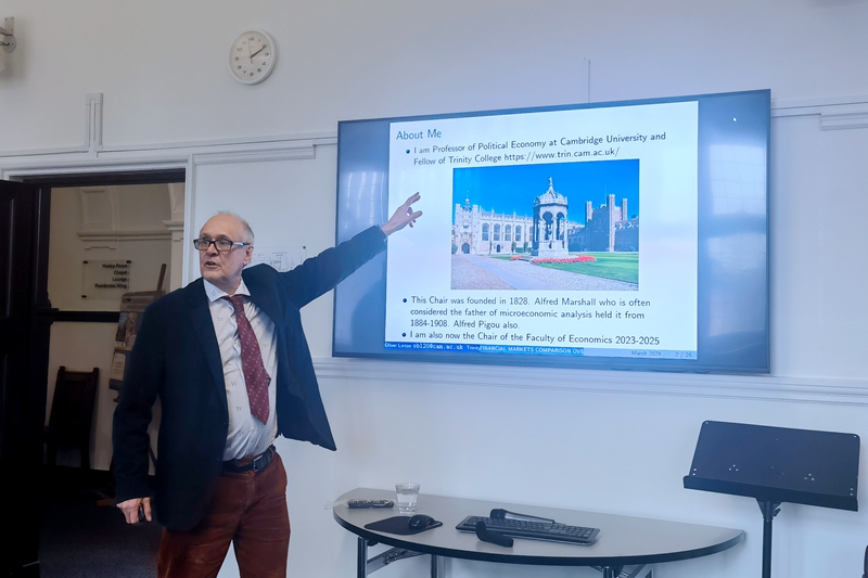 在参观校园环境之后,考察交流团聆听了剑桥大学经济学教授、剑桥大学圣三一学院院士、英国国家学术院院士、英格兰央行顾问Oliver Linton关于世界经济趋势分析以及剑桥大学经济学学科建设的大师课,教授们详尽讲解了经济学的核心内涵,深入浅出的分析了经济学学科的未来发展。