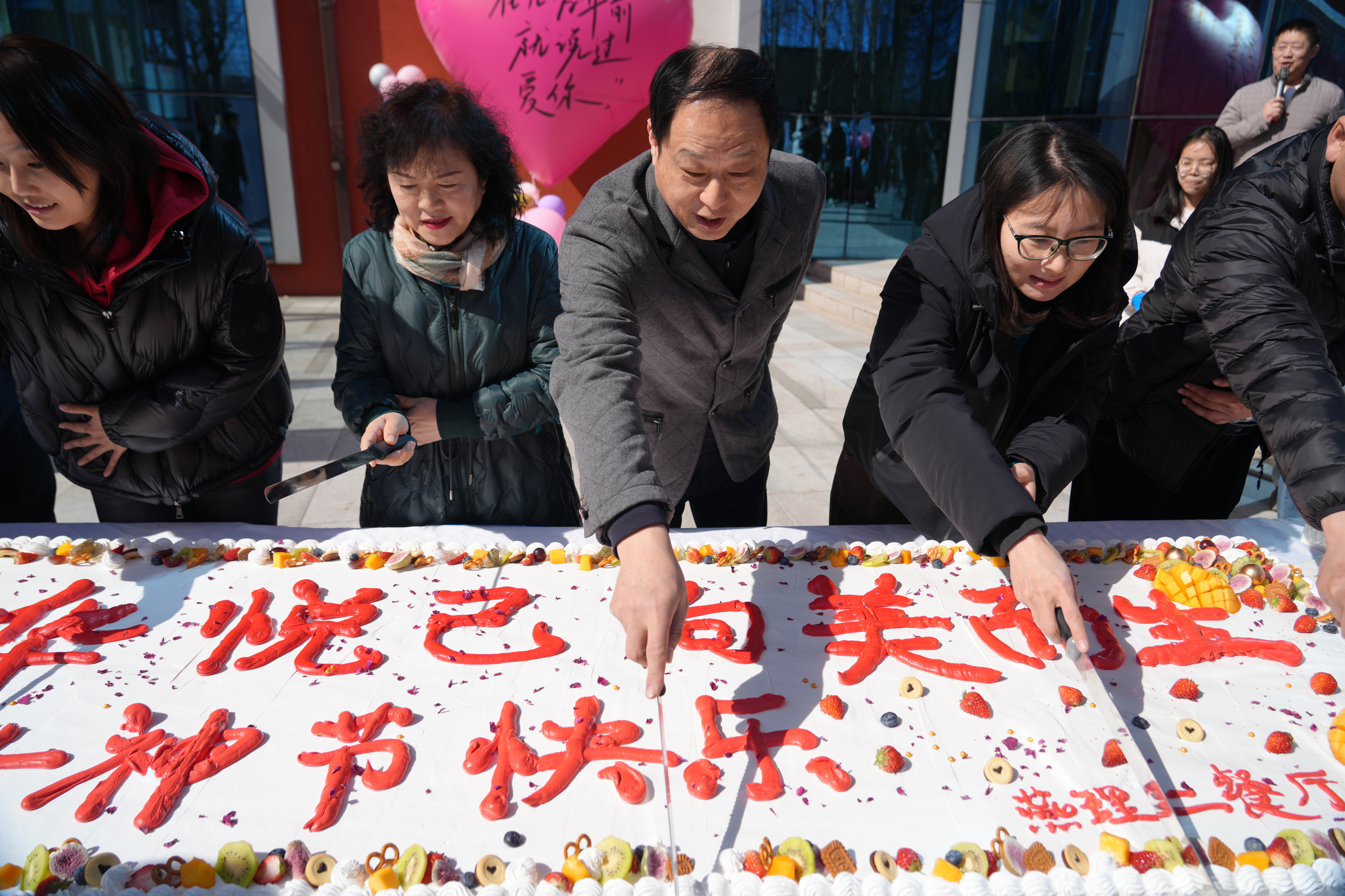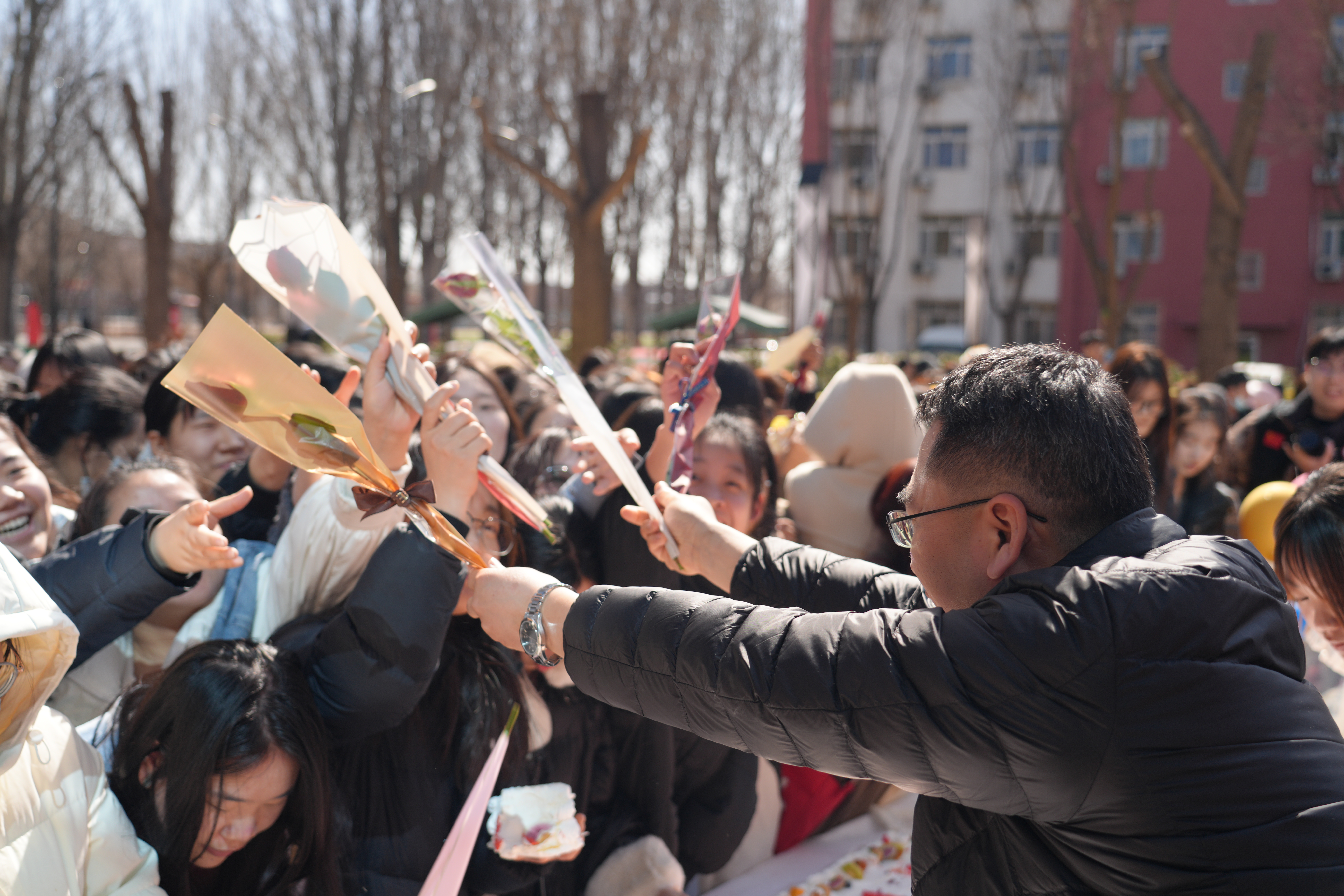 鲜花送递节日祝福、甜美蛋糕营造温馨氛围、拍照打卡墙精心布置……在第二餐厅前,副校长宋伟走进活动现场与在场师生共切节日蛋糕,并将一束束鲜花送递到师生手中,表达节日祝福。此外,活动现场还布置了抽奖活动,设置了就餐优惠券、精品钥匙链等精美礼品。大家纷纷表示,将会把这份关爱转化为精神动力,以更加饱满的状态、更加昂扬的斗志、更加优良的作风投入到学习和工作中去,汇集女性力量彰显新作为,竞展新风采。