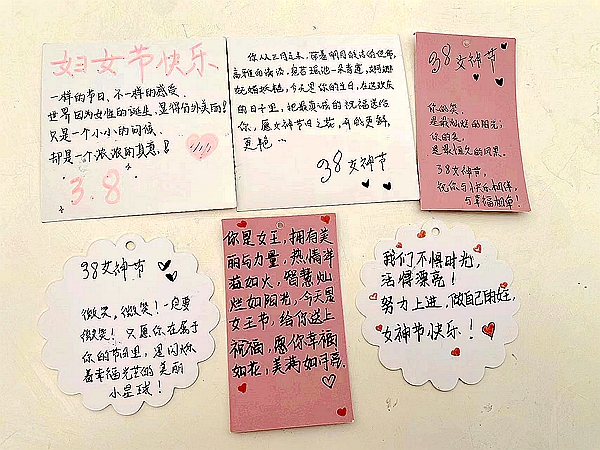 “在这个特殊的日子里,很感动能够收到来自学生的祝福,我也希望在燕理学习工作的女性同胞们健康幸福,快乐生活。”从宿管阿姨、保洁员阿姨到食堂阿姨,雷锋连的志愿者们通过手写的祝福贺卡为广大女性职工送上温馨的节日祝福。