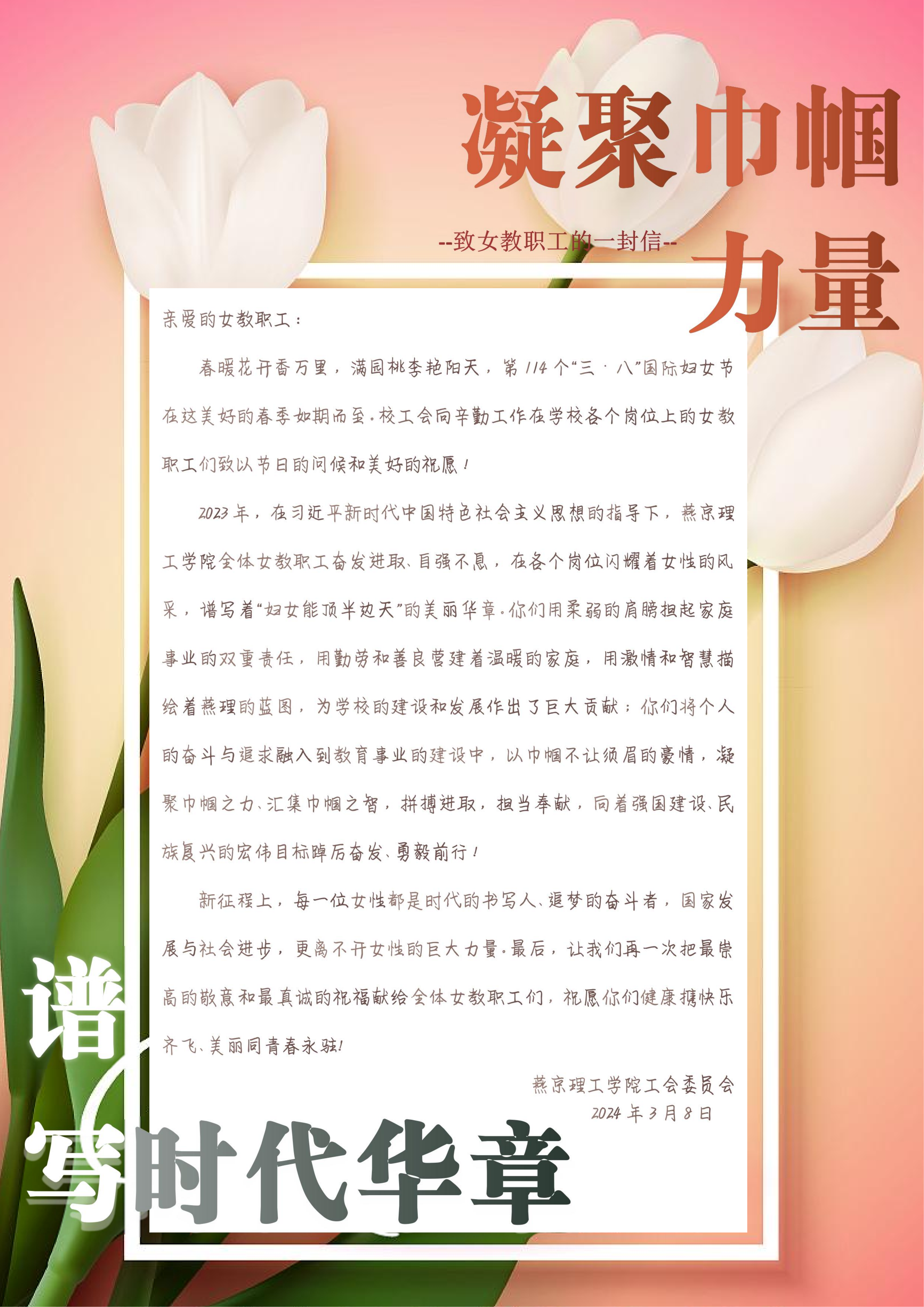 “第114个‘三八’国际妇女节在这个美好的春季如期而至,校工会向辛勤工作在学校各个岗位上的女教职工们致以节日的问候和美好的祝愿!”3月8日一早,燕京理工学院工会委员会发布了致全校女教职工的一封信,致以亲切的问候和诚挚的祝福。