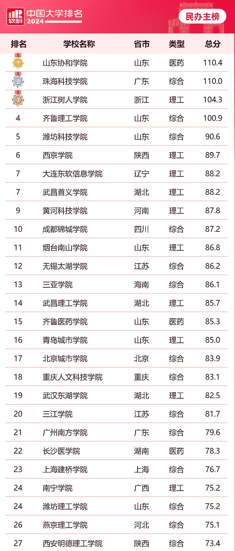 2024软科中国民办高校(主榜)排名(源自软科中国大学排名微信公众号截图)