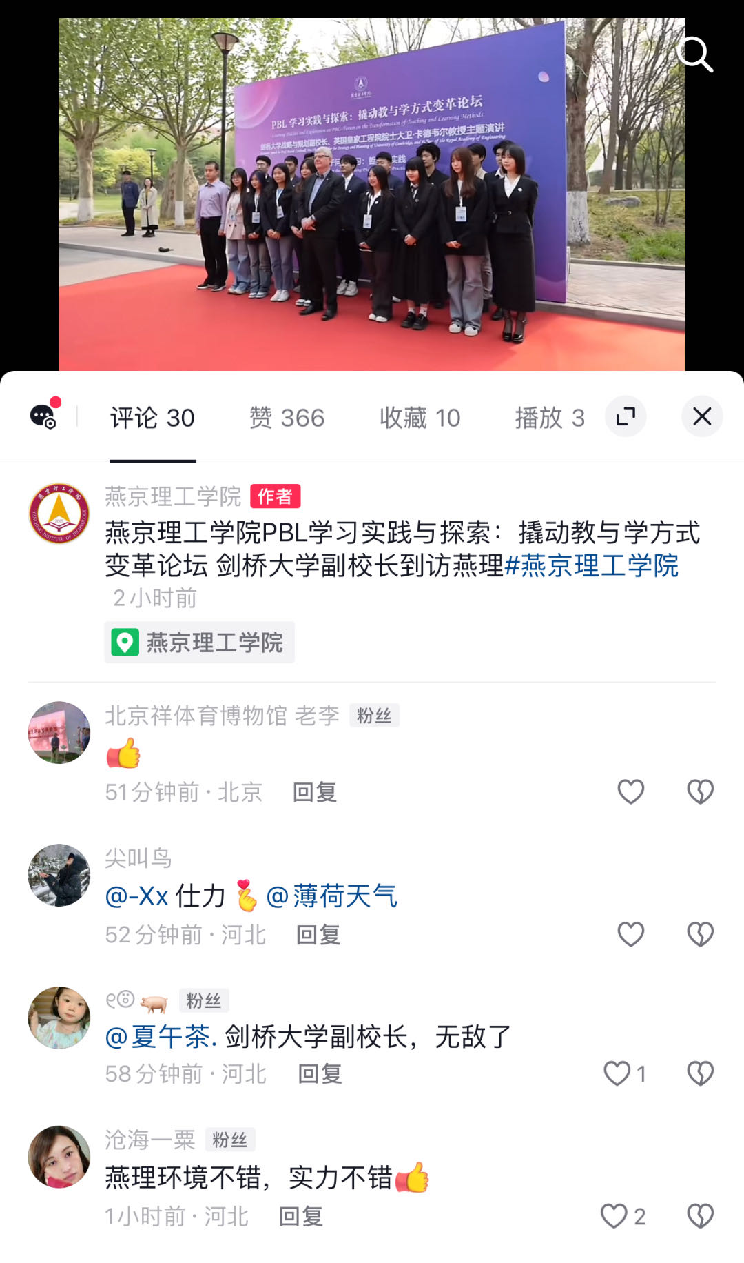 本网讯(宣传部 刘婷婷 李家曾 付盛通 谷是瑾 窦雄鑫 闫亚琳 何思达 许兴耿 孙梦朔 许博涵 陈锦腾 窦鹏润)“教授的演讲既有理论高度又有成果实践,是教与学探索的一次思想大开阔”“听了教授的讲座,我忽然知道怎么学习了”“基于问题的学习,是一场我们学生自主学习的新革命”……4月22日,燕京理工学院举办“PBL学习实践与探索:撬动教与学方式变革论坛”,探索新时代国际化人才培养的方向和路径,剑桥大学战略与规划副校长、英国皇家工程院院士大卫·卡德韦尔教授应邀作“基于问题的学习:哲学与实践”主题演讲,现场引起与会嘉宾和师生的强烈共鸣。