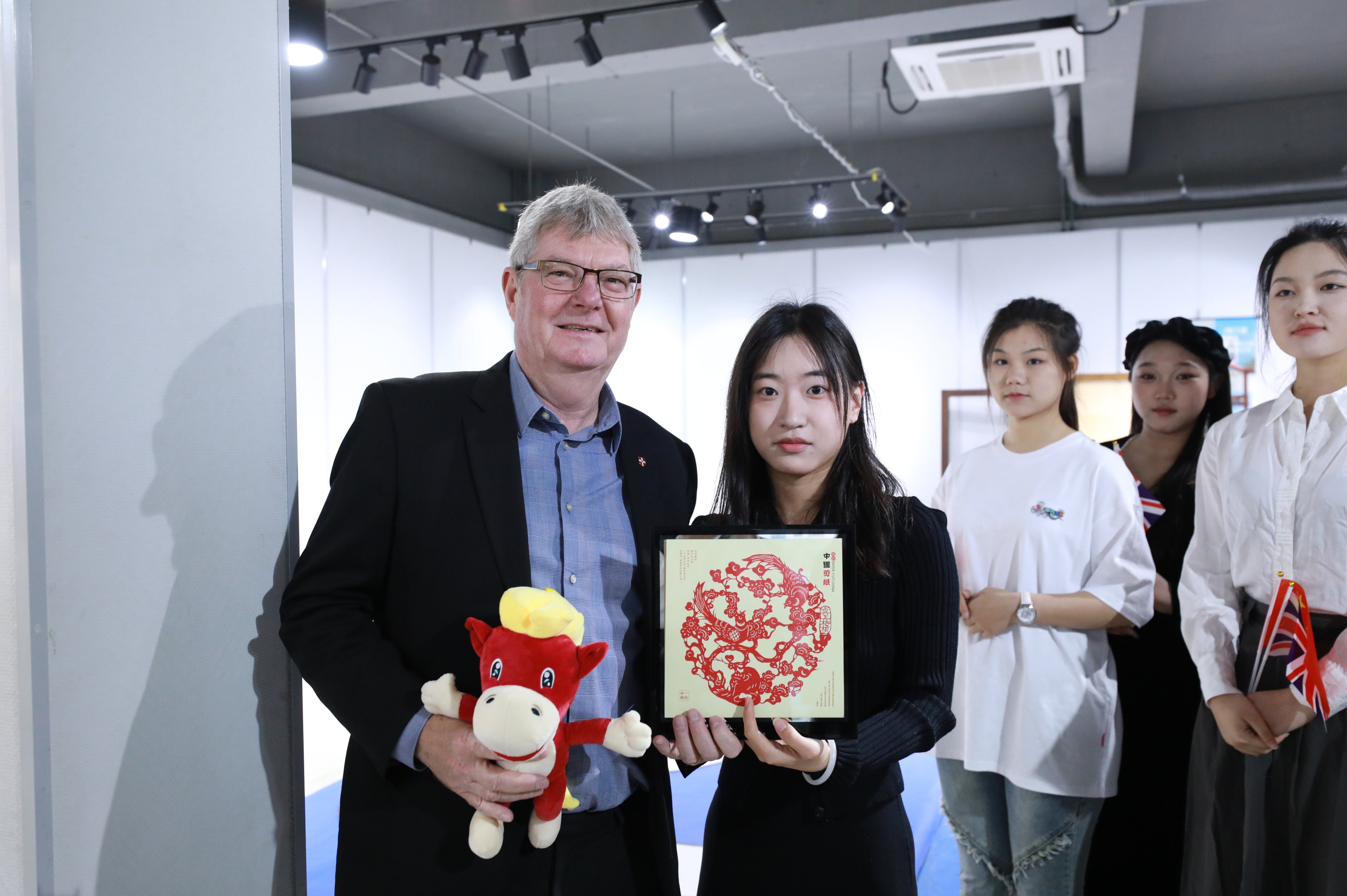 古典乐余音绕梁袅袅升起,手工剪纸的清明上河图栩栩如生,燕理学子身着传统服饰位列创新创业展。在各展位的依次介绍中,卡德韦尔教授津津有味的参观着学生的创新创业作品,学生们将精美团扇、菩提手串、印章京京的成品册等相赠卡德韦尔教授,在传承和弘扬中华传统文化中盛情迎客。