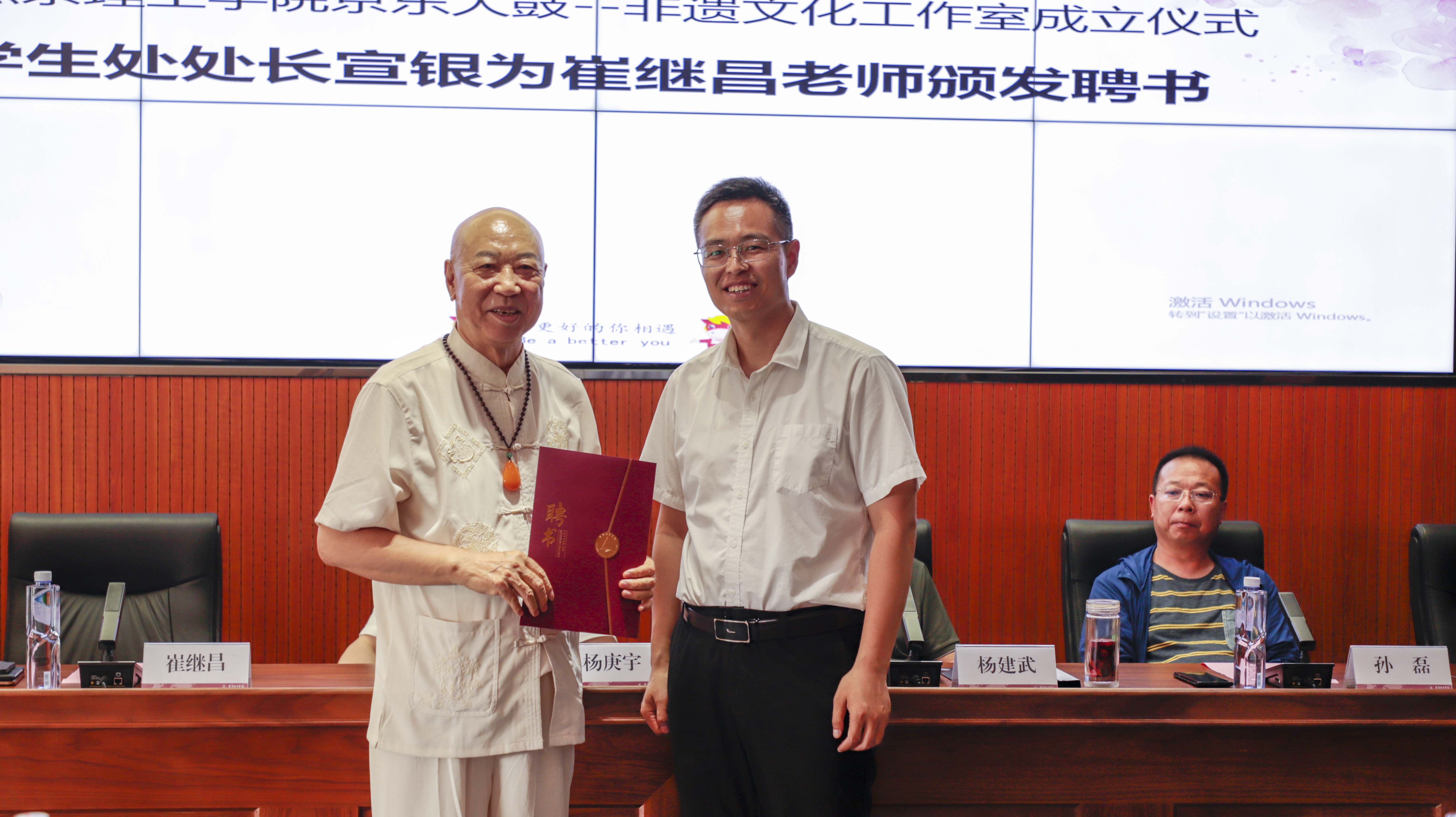 成立仪式上,党委副书记、副校长、社会公益学院院长王传超宣读《燕京理工学院关于成立非遗文化工作室的决定》。学生处处长、社会公益学院执行院长宣银为京东大鼓国家级非遗传承人崔继昌老师颁发美育导师聘书。工作室成员李帅老师代表学员做了发言,表达了立志要守护、传承京东大鼓非遗项目的决心。