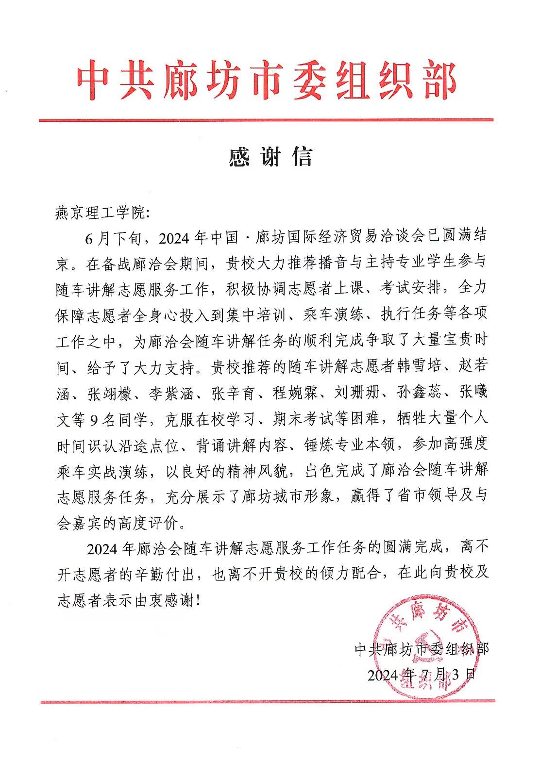 本网讯(传媒学院 左冬兴)7月3日,燕京理工学院收到中共廊坊市委组织部的感谢信,信中对我校9名志愿者在廊洽会的志愿工作给予了感谢和表扬。
