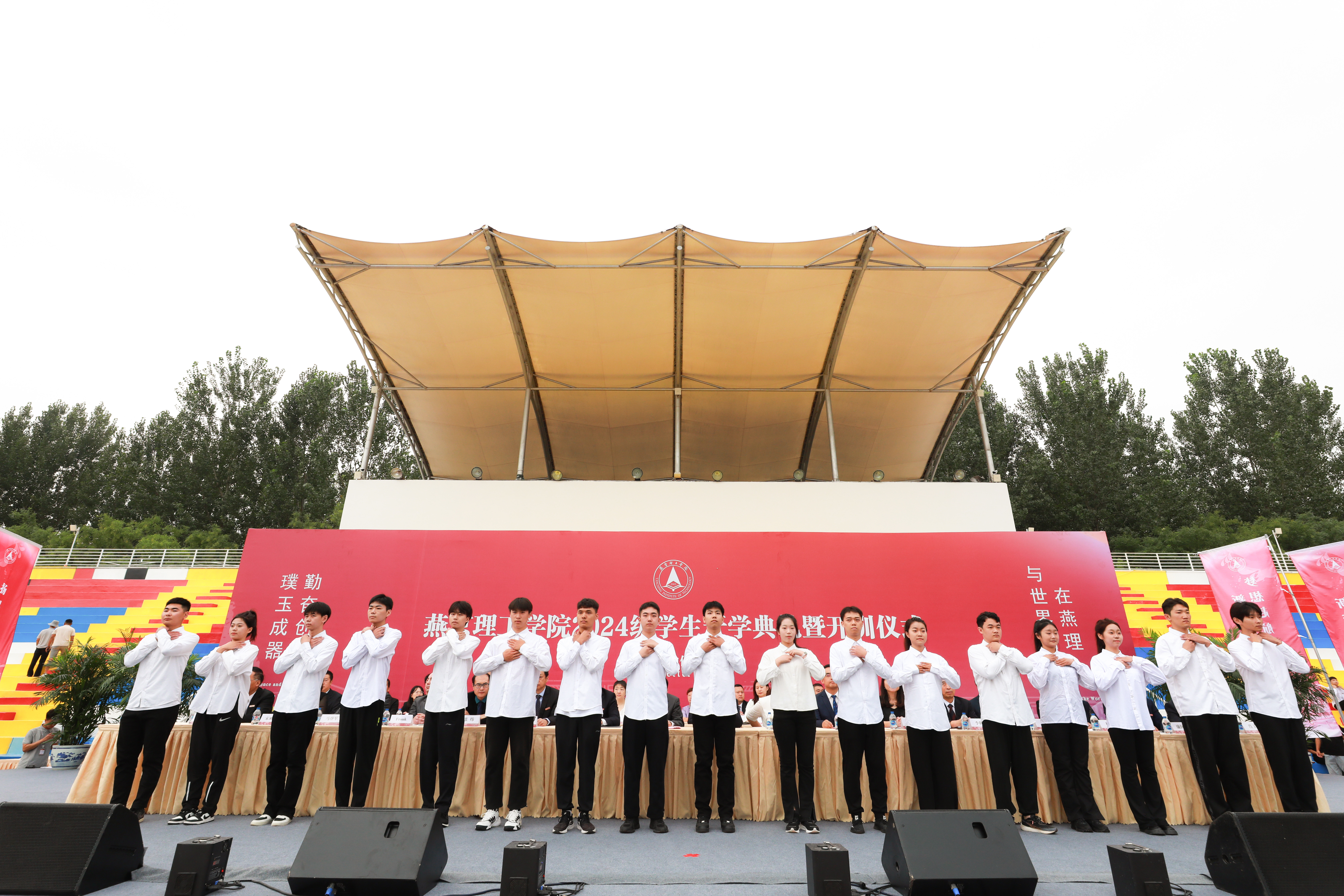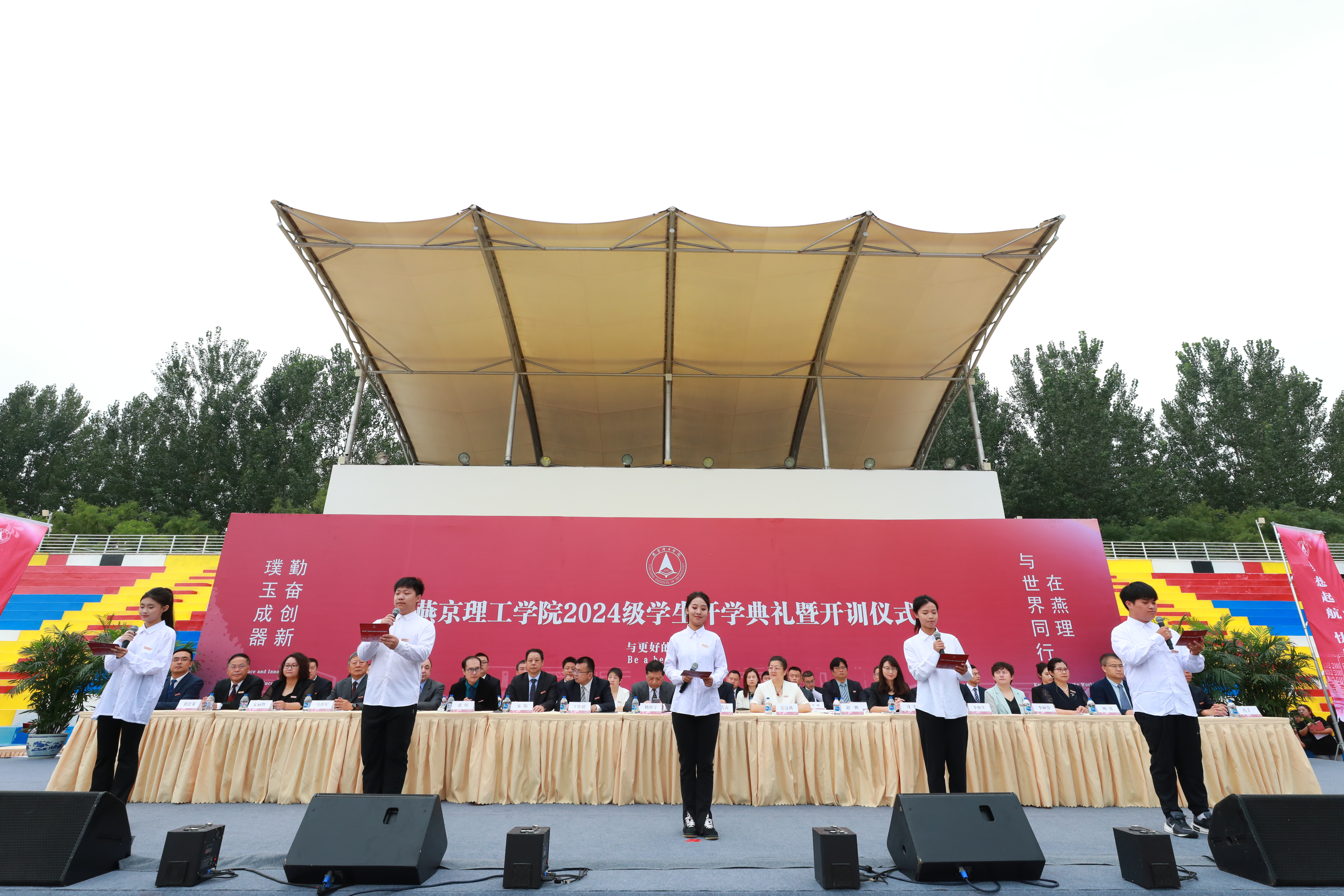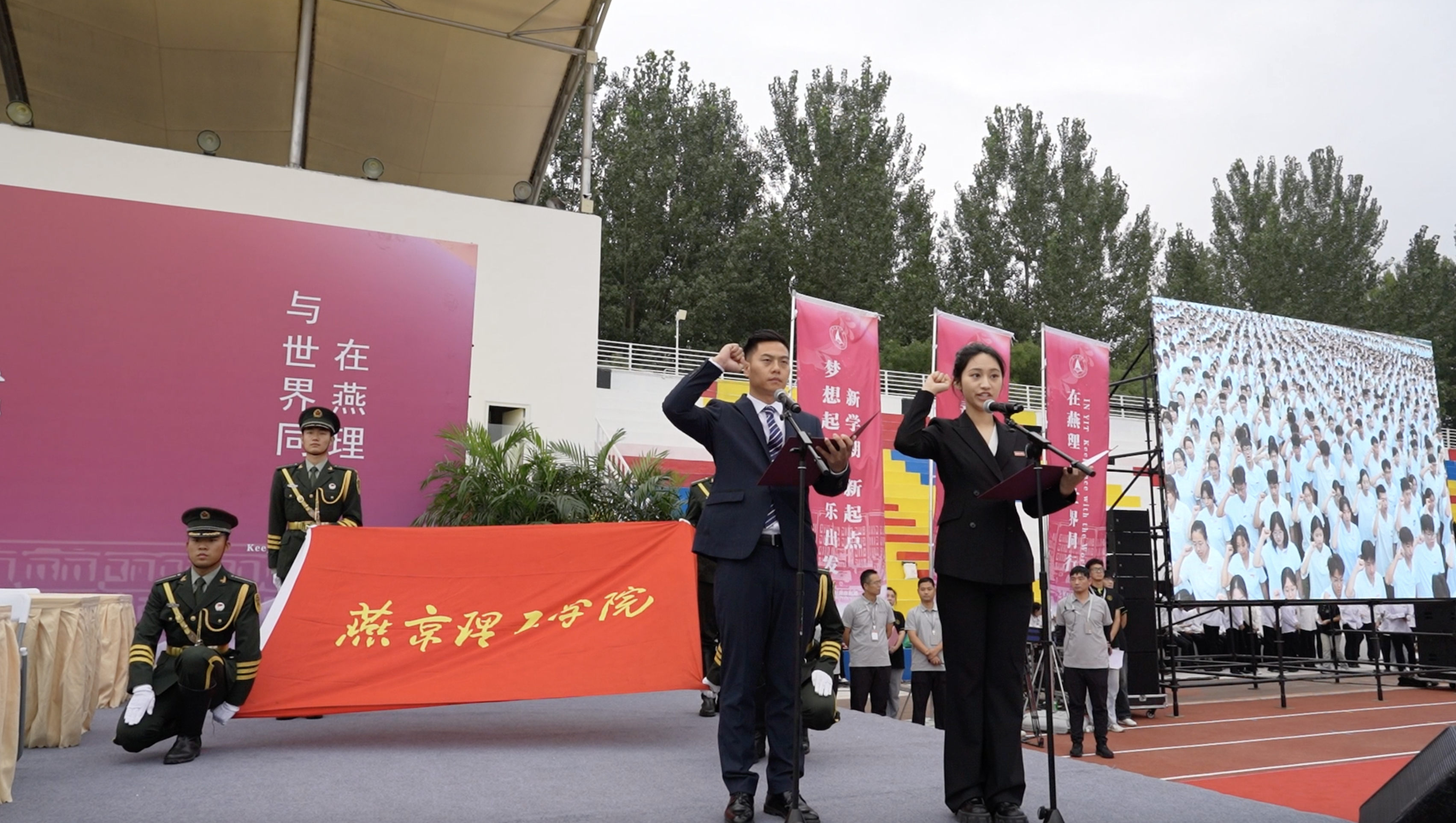 2024级新生入学宣誓环节由优秀校友和在校生代表一同领誓。在2018届毕业生、河北黔武体育文化有限公司创始人张前和传媒学院播音与主持专业尹天姿的带领下,铮铮誓言铿锵有力,庄严承诺笃行不怠。同学们庄严宣誓:作为燕京理工学院学生,秉承校训,勤奋创新 璞玉成器,尊师重道,感念师恩,明德励志,博学笃行,格物致知,共担共享,争做会做人、会学习、会做事,会与人共处;有感恩知心、有博大胸怀,有吃苦精神、有创新意识,有创业能力的时代新人,胸怀家国天下,追求卓越进步,肩负伟大使命,建设现代化强国,献身民族复兴!